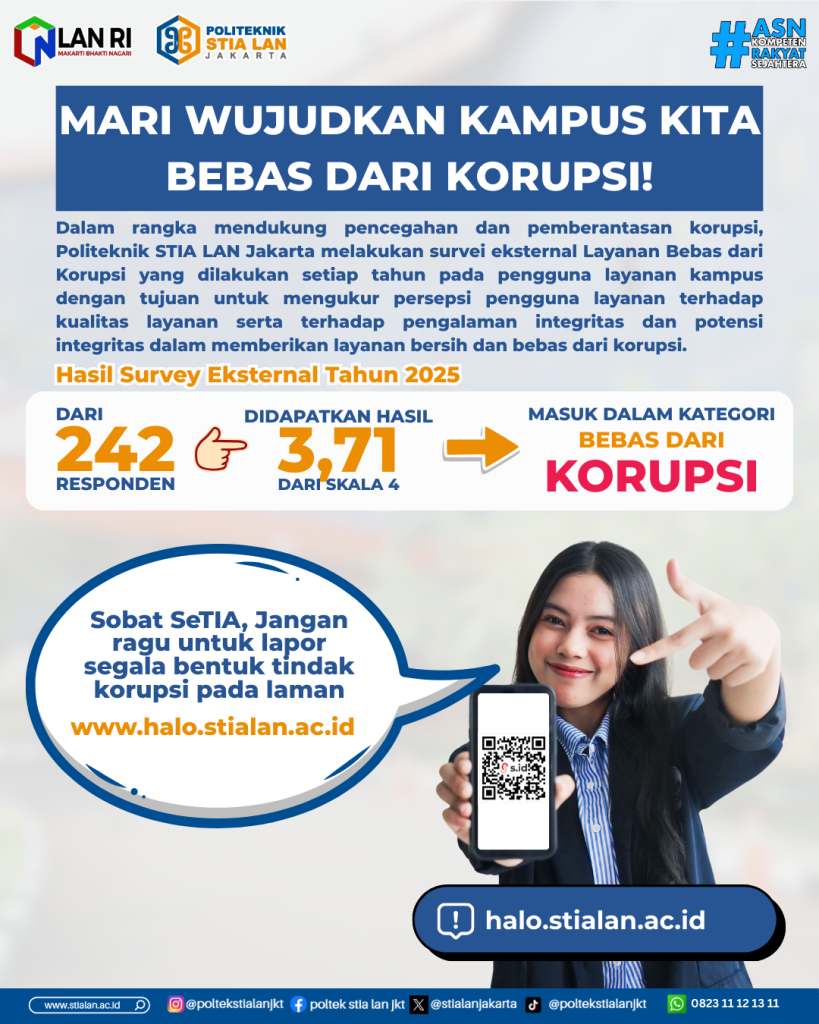 Dalam rangka mendukung pencegahan dan pemberantasan korupsi, Politeknik STIA LAN Jakarta melakukan survei eksternal Layanan Bebas dari Korupsi yang dilakukan setiap tahun pada pengguna layanan kampus dengan tujuan untuk mengukur persepsi pengguna layanan terhadap kualitas layanan serta terhadap pengalaman integritas dan potensi integritas dalam memberikan layanan bersih dan bebas dari korupsi.