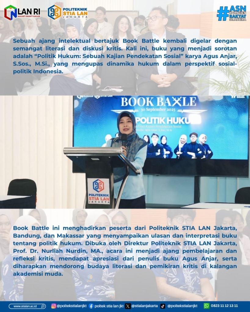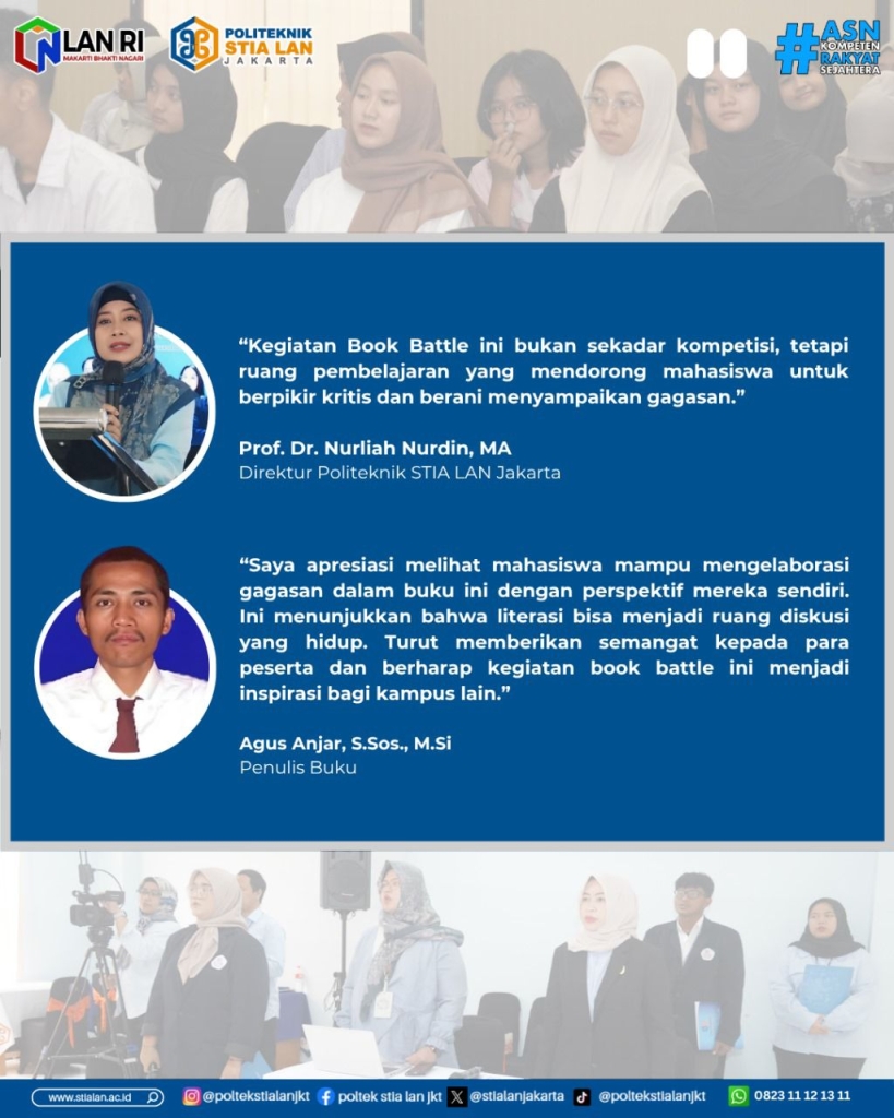 Acara ini tidak hanya menjadi ajang kompetisi, tetapi juga wadah pembelajaran dan refleksi kritis bagi mahasiswa terhadap realitas politik hukum di Indonesia. Penulis buku, Agus Anjar, turut memberikan apresiasi atas antusiasme peserta dan berharap kegiatan semacam ini dapat terus mendorong budaya literasi dan pemikiran kritis di kalangan akademisi muda. Kegiatan Book Battle yang dilakukan Politeknik STIA LAN Jakarta ini menjadi inspirasi bagi kampus lain.