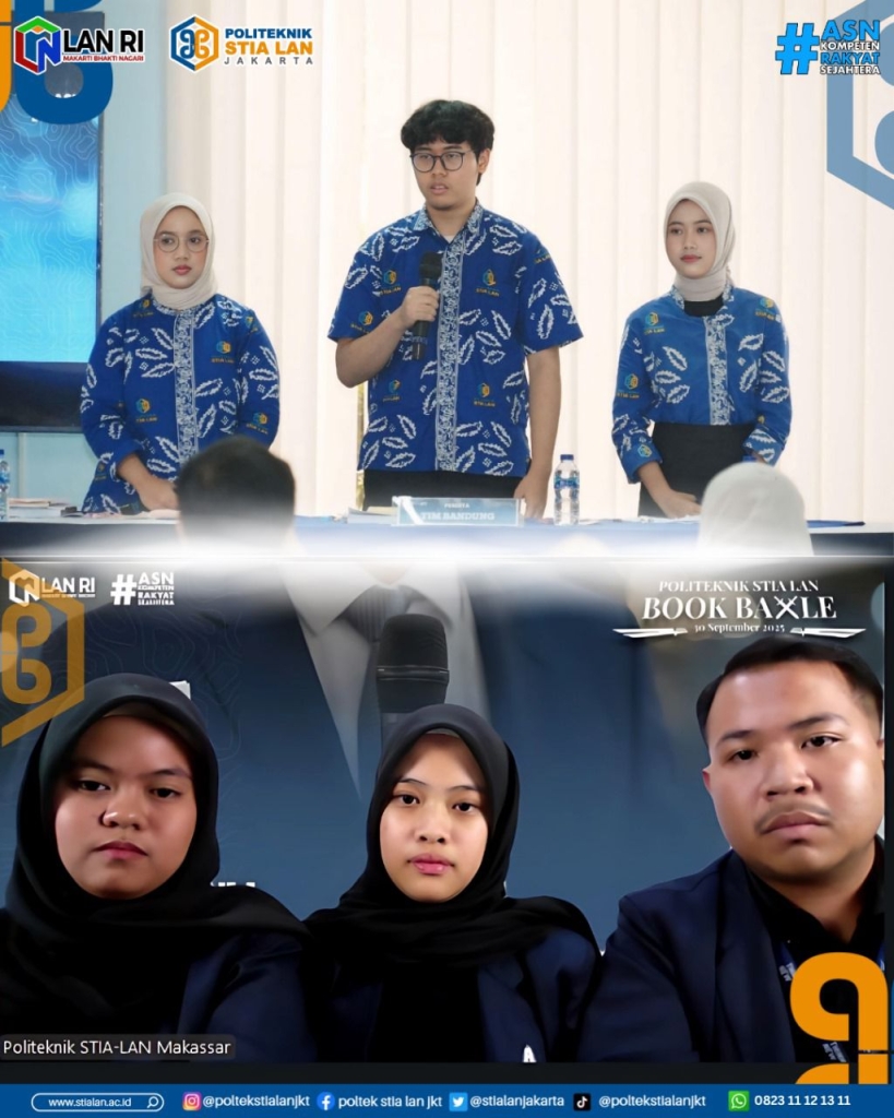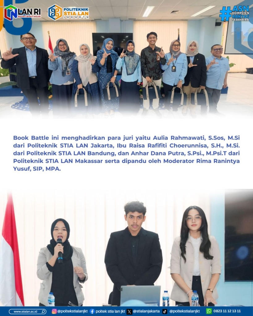 Book Battle ini menghadirkan para juri yaitu: Aulia Rahmawati, S.Sos, M.Si dari Politeknik STIA LAN Jakarta, Raisa Rafifiti Choerunnisa, S.H., M.Si. dari Politeknik STIA LAN Bandung, dan Anhar Dana Putra, S.Psi., M.Psi.T dari Politeknik STIA LAN Makassar serta dipandu oleh Moderator Rima Ranintya Yusuf, SIP, MPA.
