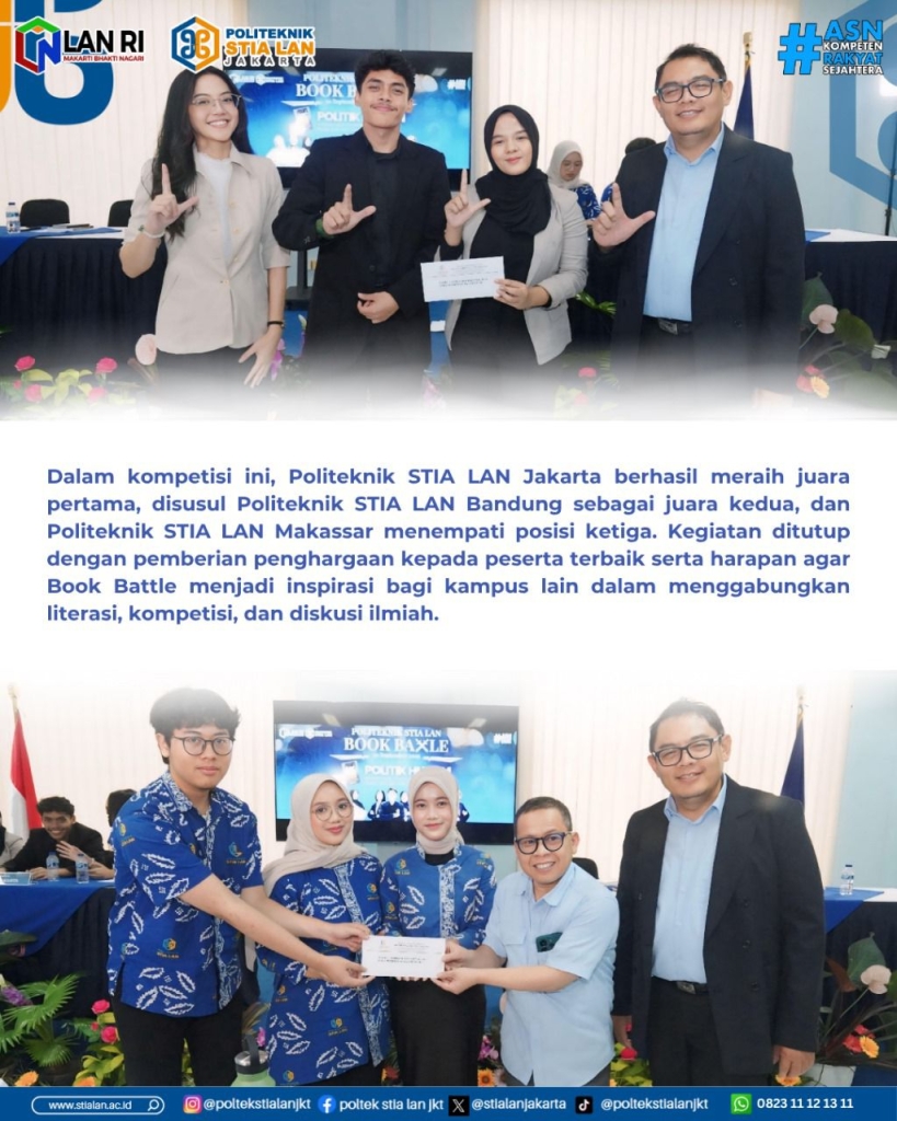 Juara pertama diraih oleh Tim dari Politeknik STIA LAN Jakarta, juara kedua Tim Politeknik STIA LAN Bandung, dan juara ketiga diraih Politeknik STIA LAN Makasar. Kegiatan Book Battle ini diharapkan menjadi inspirasi bagi mahasiswa untuk gemar membaca buku, memperluas wawasan, dan mengembangkan tradisi literasi di kampus.