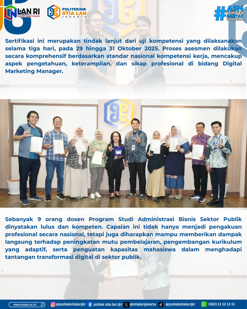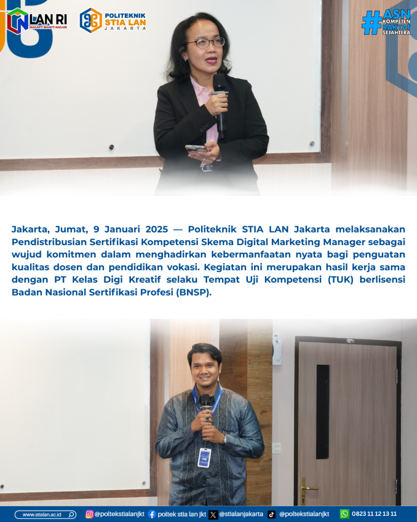 Jakarta, Jumat, 9 Januari 2025 — Politeknik STIA LAN Jakarta melaksanakan Pendistribusian Sertifikasi Kompetensi Skema Digital Marketing Manager sebagai wujud komitmen dalam menghadirkan kebermanfaatan nyata bagi penguatan kualitas dosen dan pendidikan vokasi. Kegiatan ini merupakan hasil kerja sama dengan PT Kelas Digi Kreatif selaku Tempat Uji Kompetensi (TUK) berlisensi Badan Nasional Sertifikasi Profesi (BNSP).