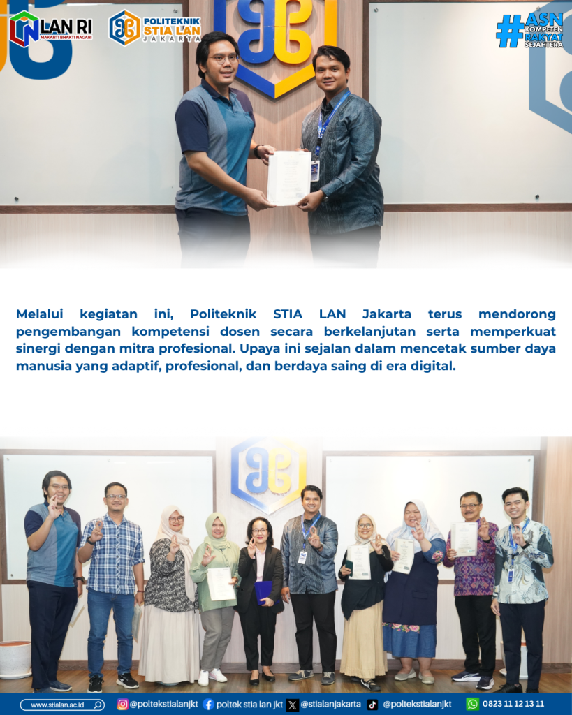 Melalui kegiatan ini, Politeknik STIA LAN Jakarta terus mendorong pengembangan kompetensi dosen secara berkelanjutan serta memperkuat sinergi dengan mitra profesional. Upaya ini sejalan dalam mencetak sumber daya manusia yang adaptif, profesional, dan berdaya saing di era digital.