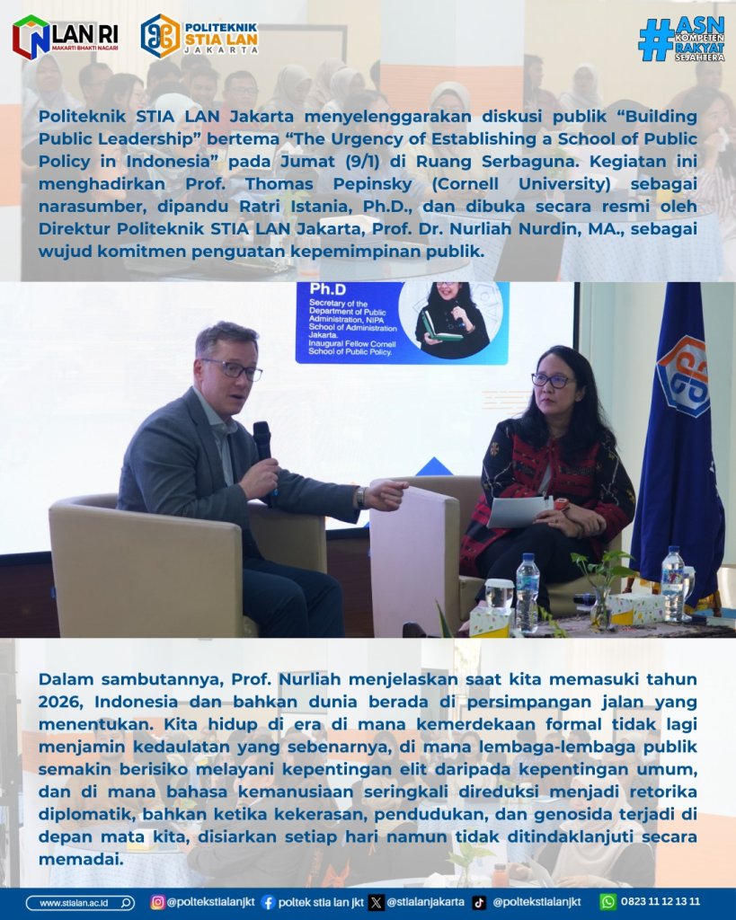 Jakarta, 9 Januari 2026 – Politeknik STIA LAN Jakarta menggelar diskusi publik bertajuk “Building Public Leadership” yang membahas “The Urgency of Establishing a School of Public Policy in Indonesia” dengan menghadirkan Prof. Thomas Pepinsky dari Universitas Cornell, Amerika Serikat dipandu Moderator Ratri Istania, Ph.D. Secretary of the Department of Public Administration, NIPA School of Administration Jakarta Inaugural Fellow, Cornell School of Public Policy. Kegiatan ini secara resmi dibuka oleh Direktur Politeknik STIA LAN Jakarta, Prof. Dr. Nurliah Nurdin, MA. sebagai bentuk komitmen institusi dalam mendorong penguatan kapasitas kepemimpinan publik pada Jumat (9/1) bertempat di R Serbaguna Politeknik STIA LAN Jakarta.