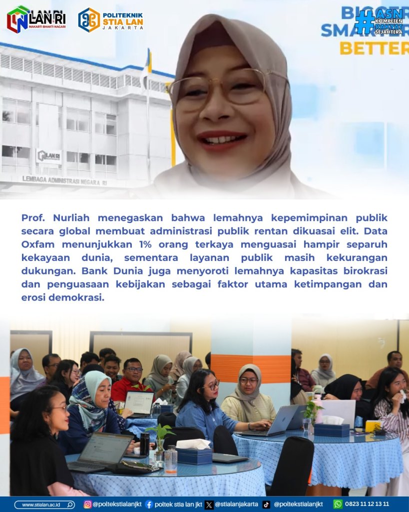 Prof. Nurliah menambahkan secara global, bukti menunjukkan bahwa ketika kepemimpinan lemah atau dikuasai, administrasi publik menjadi instrumen konsolidasi elit daripada pelayanan publik. Menurut Oxfam, 1% orang terkaya mengendalikan hampir setengah dari kekayaan global, sementara sistem publik; pendidikan, kesehatan, perlindungan sosial, tetap kekurangan dana atau salah arah di banyak negara. Bank Dunia memperingatkan bahwa penguasaan kebijakan dan kemampuan birokrasi yang lemah merupakan salah satu prediktor terkuat dari ketidaksetaraan yang terus-menerus dan erosi demokrasi.