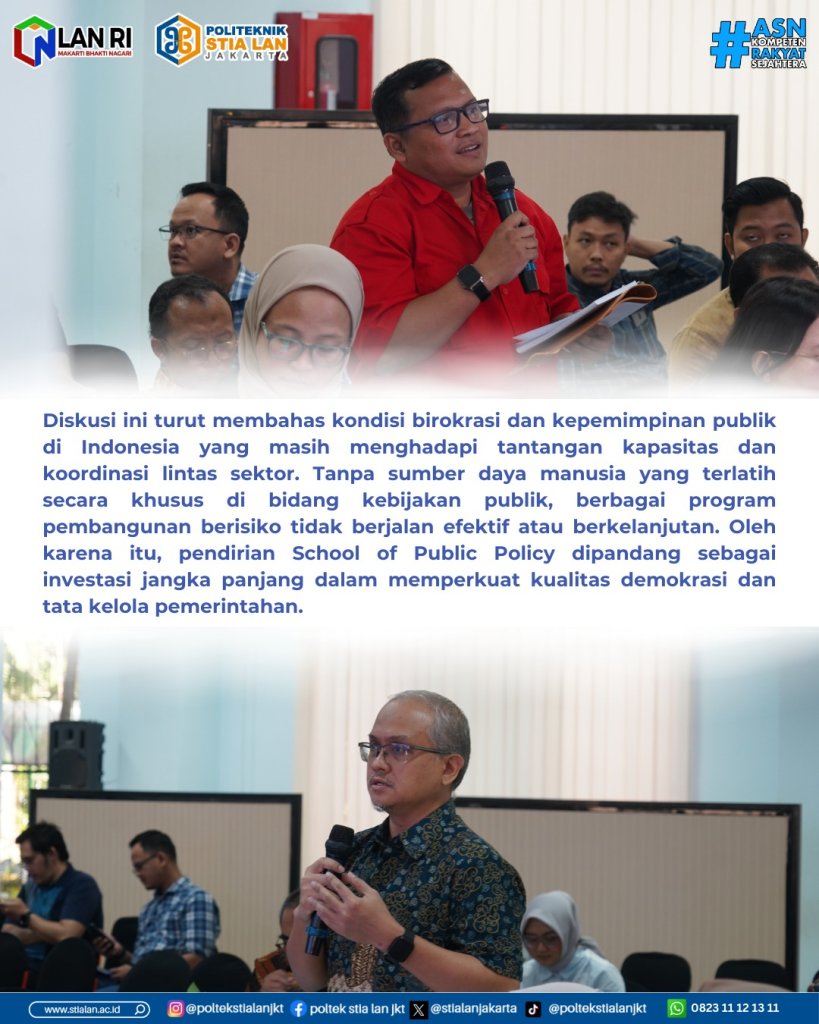 Diskusi publik Building Public Leadership diikuti oleh kalangan akademisi, mahasiswa, praktisi kebijakan, serta pemerhati isu pemerintahan. Para peserta berdiskusi terkait dengan Strategi yang diterapkan oleh Sekolah-Sekolah Ivy League (Universitas Cornell) di tengah Pemerintahan Trump? Pelajaran yang dapat dipetik untuk STIA LAN?, meningkatkan profesionalisme kebijakan dalam kepemimpinan layanan sipil dan sektor public, Dengan cara apa Sekolah Kebijakan Publik dapat memperkuat kepemimpinan, tata kelola etis, dan pemikiran strategis di antara pejabat public, nilai strategis apa yang benar-benar akan membedakan Sekolah Kebijakan Publik yang diusulkan dari program-program yang sudah ada, dalam hal misi, pendekatan pendidikan, dan kontribusi konkret untuk meningkatkan kualitas kebijakan publik nasional?, bagaimana cara menyinergikan berbagai aliran kebijakan publik di Indonesia dengan lingkungan global Sekolah Kebijakan Publik? dan pertanyaan lainnya.