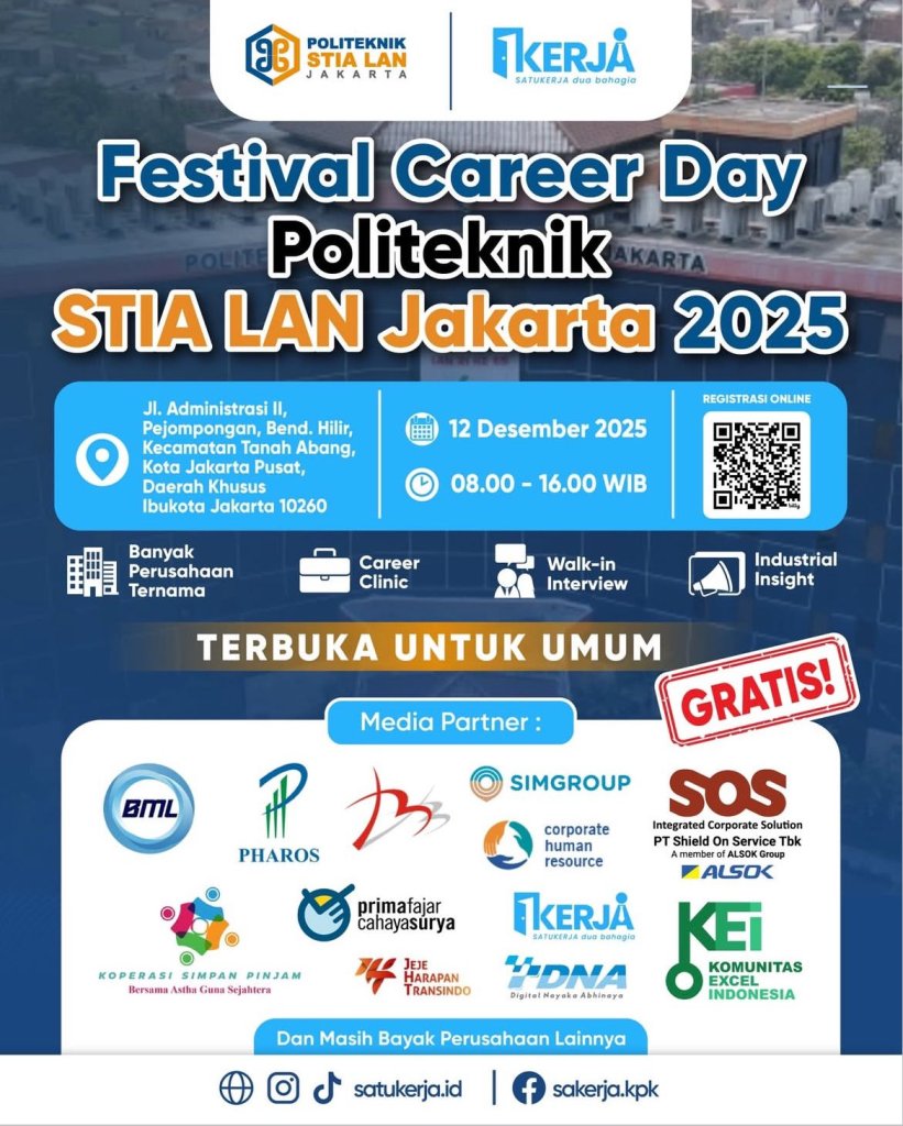 festival career day politeknik STIA LAN Jakarta 2025 kembali hadir sebagai wadah terbuka untuk seluruh pencari kerja yang ingin memperluas peluang dan bertemu langsung dengan perusahaan ternama. acara ini menghadirkan berbagai booth perusahaan, sesi career clinic, hingga kesempatan walk in interview dalam satu hari.