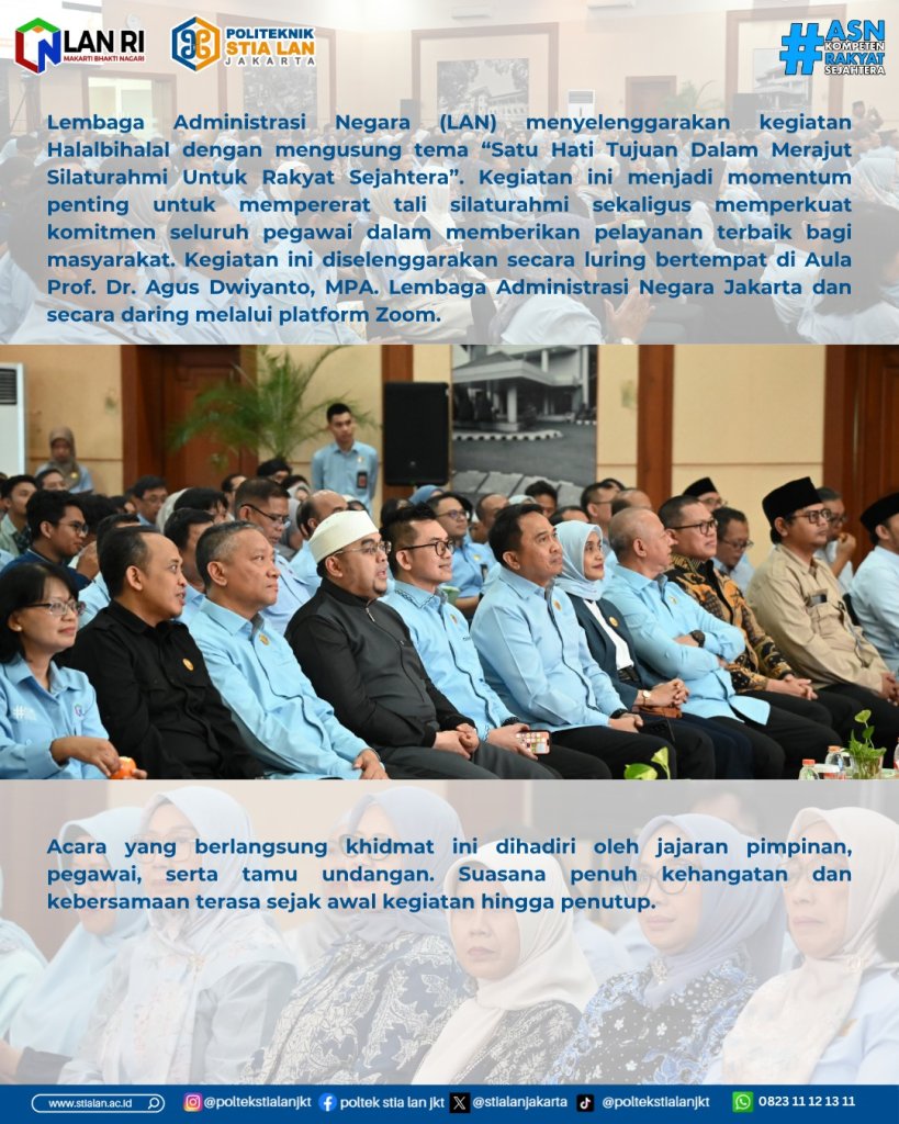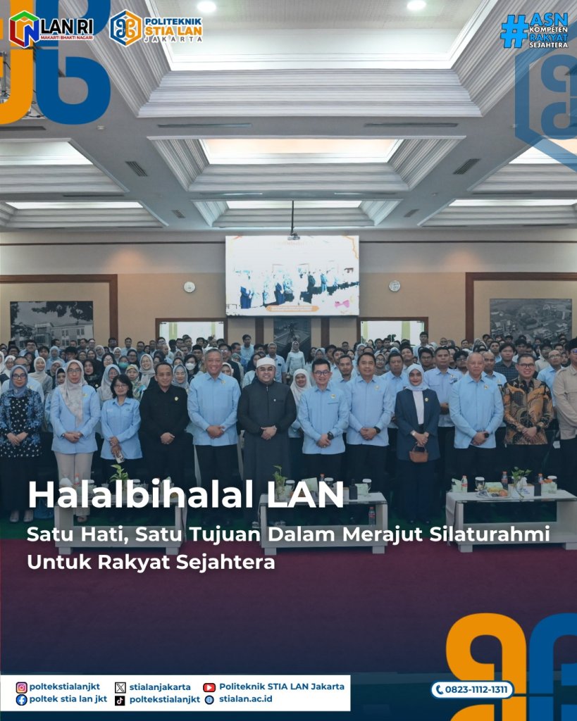 Jakarta, 31 Maret 2026 – Lembaga Administrasi Negara (LAN) menyelenggarakan kegiatan Halalbihalal dengan mengusung tema “Satu Hati Tujuan Dalam Merajut Silaturahmi Untuk Rakyat Sejahtera”. Kegiatan ini menjadi momentum penting untuk mempererat tali silaturahmi sekaligus memperkuat komitmen seluruh pegawai dalam memberikan pelayanan terbaik bagi masyarakat. Kegiatan ini diselenggarakan secara luring bertempat di Aula Prof. Dr. Agus Dwiyanto, MPA. Lembaga Administrasi Negara Jakarta dan secara daring melalui platform Zoom.