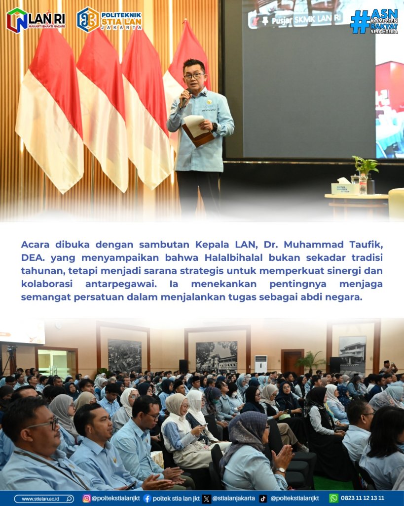 Acara dibuka dengan sambutan Kepala LAN, Dr. Muhammad Taufik, DEA. yang menyampaikan bahwa Halalbihalal bukan sekadar tradisi tahunan, tetapi menjadi sarana strategis untuk memperkuat sinergi dan kolaborasi antarpegawai. Ia menekankan pentingnya menjaga semangat persatuan dalam menjalankan tugas sebagai abdi negara.