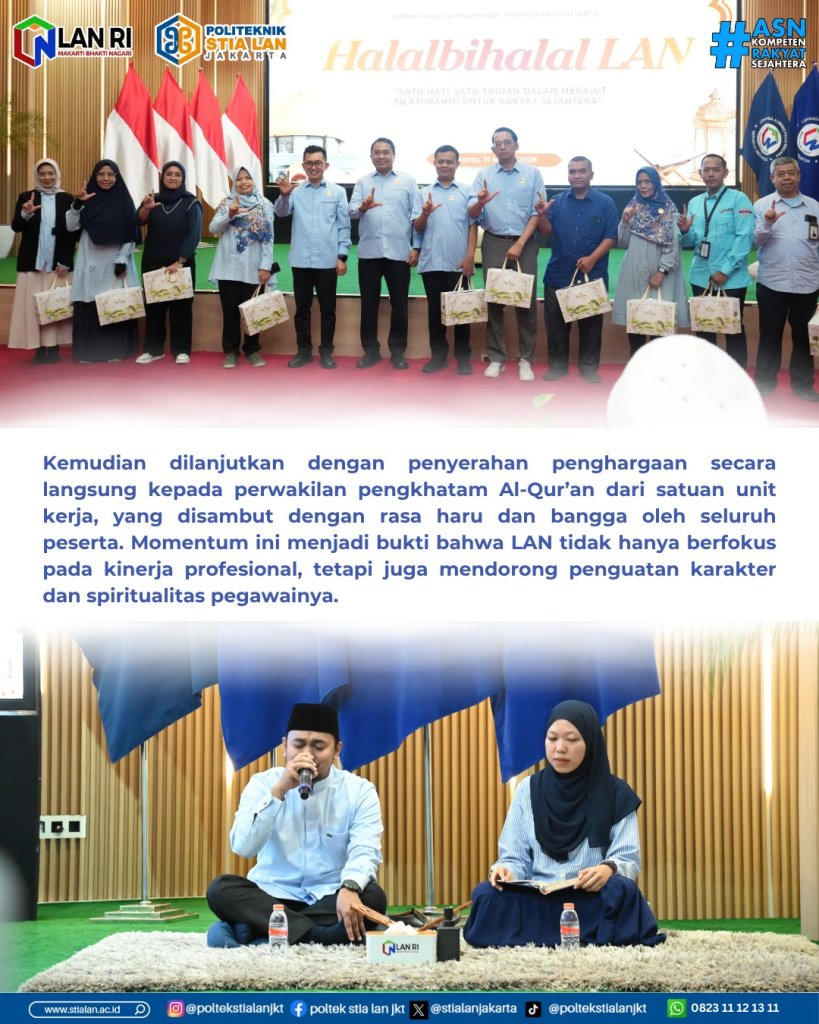 Kemudian dilanjutkan dengan penyerahan penghargaan secara langsung kepada perwakilan pengkhatam Al-Qur’an dari satuan unit kerja, yang disambut dengan rasa haru dan bangga oleh seluruh peserta. Momentum ini menjadi bukti bahwa LAN tidak hanya berfokus pada kinerja profesional, tetapi juga mendorong penguatan karakter dan spiritualitas pegawainya.