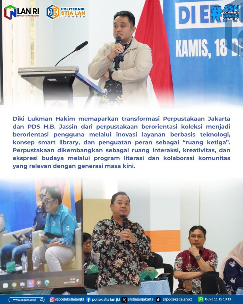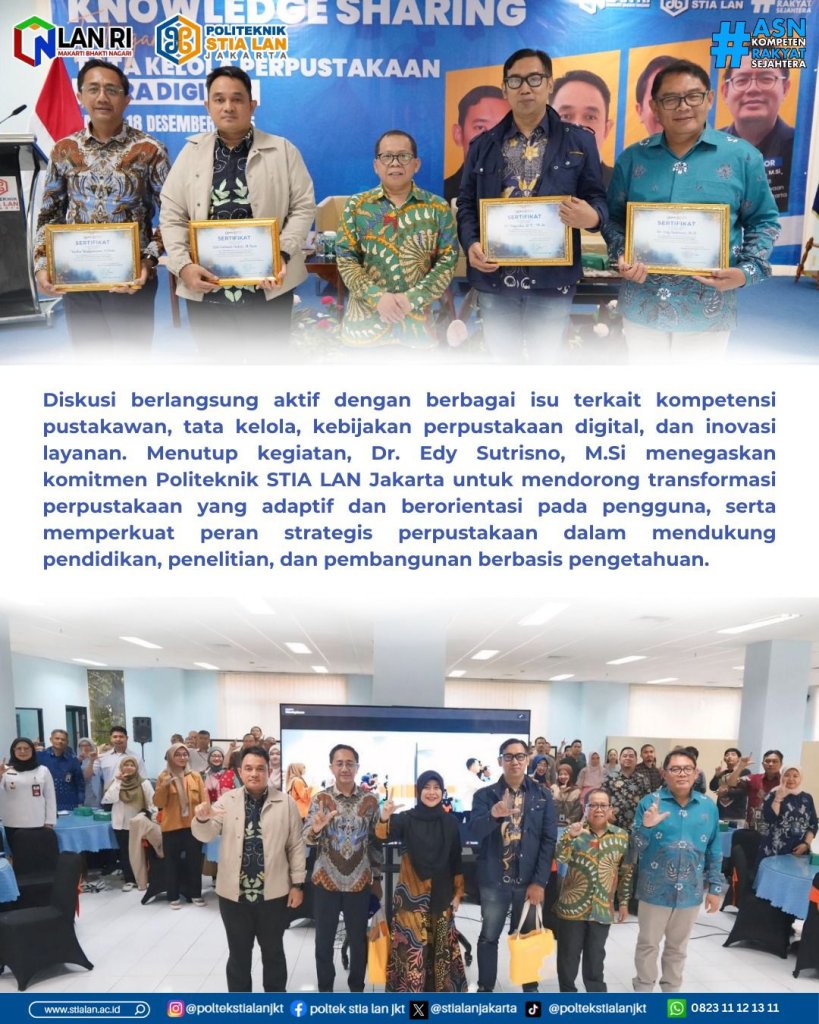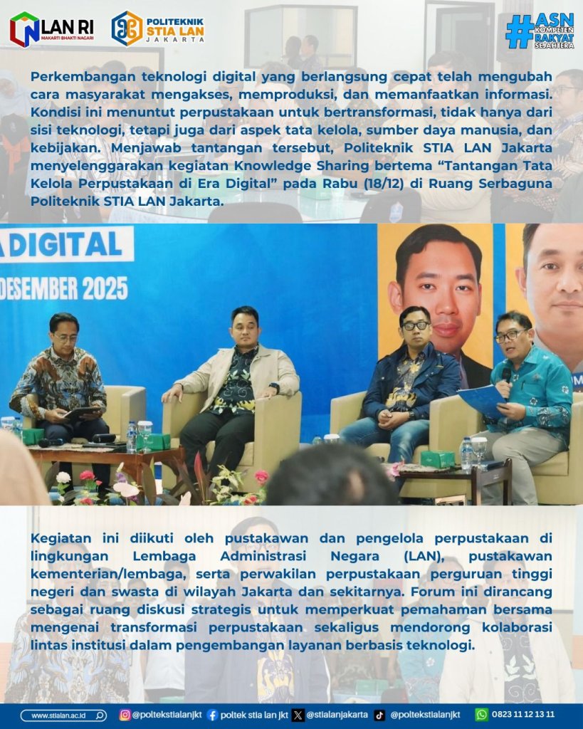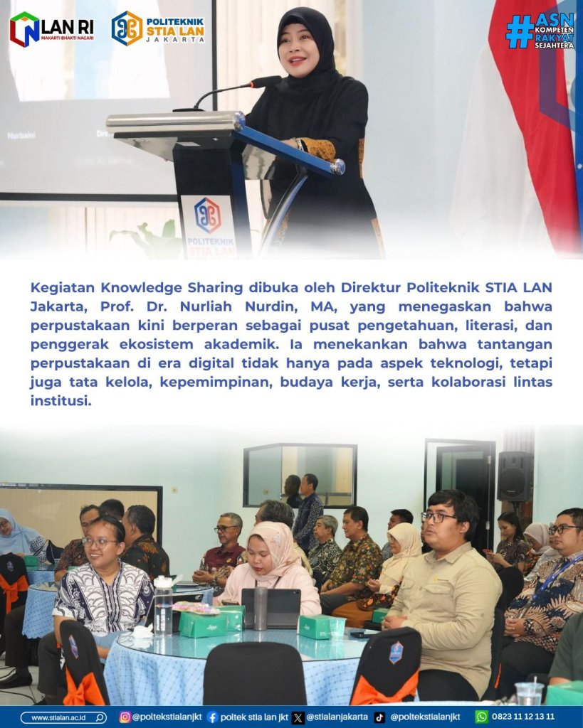 Jakarta, 18 Desember 2025 – Perkembangan teknologi digital yang berlangsung cepat telah mengubah cara masyarakat mengakses, memproduksi, dan memanfaatkan informasi. Kondisi ini menuntut perpustakaan untuk bertransformasi, tidak hanya dari sisi teknologi, tetapi juga dari aspek tata kelola, sumber daya manusia, dan kebijakan. Menjawab tantangan tersebut, Politeknik STIA LAN Jakarta menyelenggarakan kegiatan Knowledge Sharing bertema “Tantangan Tata Kelola Perpustakaan di Era Digital” pada Rabu (18/12) di Ruang Serbaguna Politeknik STIA LAN Jakarta.
