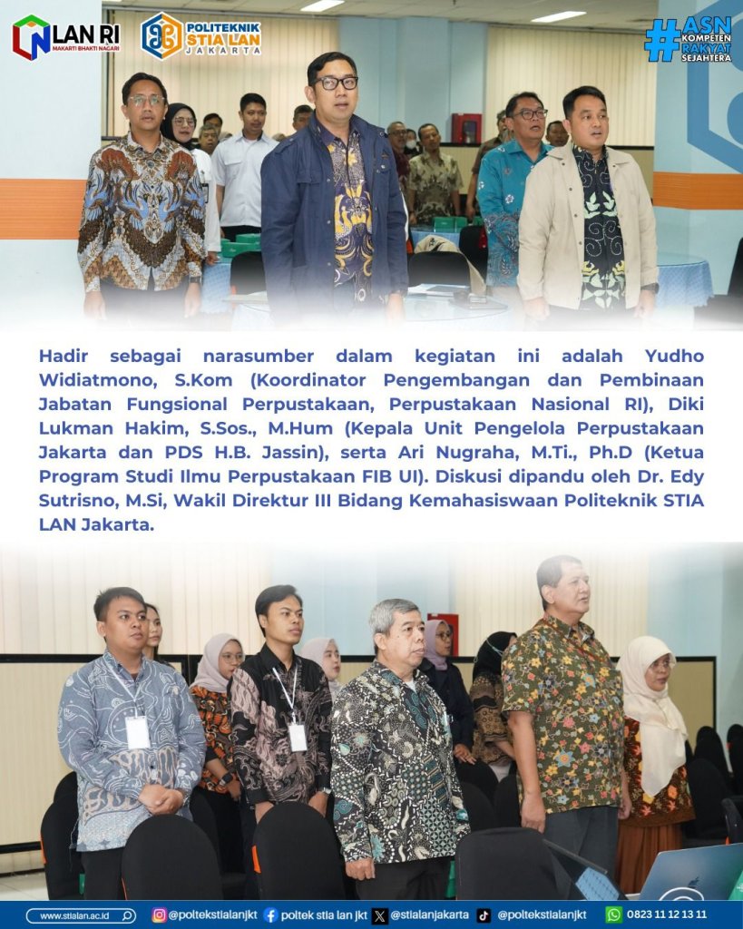 Hadir sebagai narasumber dalam kegiatan ini adalah Yudho Widiatmono, S.Kom (Koordinator Pengembangan dan Pembinaan Jabatan Fungsional Perpustakaan, Perpustakaan Nasional RI), Diki Lukman Hakim, S.Sos., M.Hum (Kepala Unit Pengelola Perpustakaan Jakarta dan PDS H.B. Jassin), serta Ari Nugraha, M.Ti., Ph.D (Ketua Program Studi Ilmu Perpustakaan FIB UI). Diskusi dipandu oleh Dr. Edy Sutrisno, M.Si, Wakil Direktur III Bidang Kemahasiswaan Politeknik STIA LAN Jakarta.