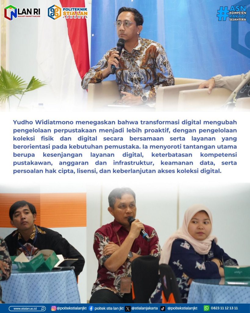 Dalam paparannya, Yudho Widiatmono menekankan bahwa transformasi digital telah mengubah paradigma pengelolaan perpustakaan. Perpustakaan kini dituntut mengelola koleksi fisik dan digital secara bersamaan, serta beralih dari layanan pasif menjadi layanan yang proaktif dan berorientasi pada kebutuhan pemustaka. Ekspektasi pengguna, khususnya generasi digital, semakin tinggi terhadap layanan yang cepat, mudah diakses, dan tersedia tanpa batas ruang dan waktu. Yudho mengidentifikasi sejumlah tantangan utama dalam pengelolaan perpustakaan di era digital, antara lain kesenjangan layanan digital, keterbatasan kompetensi pustakawan, keterbatasan anggaran dan infrastruktur, serta isu keamanan dan perlindungan data pemustaka. Selain itu, pengelolaan koleksi digital juga menghadapi persoalan hak cipta, lisensi, keberlanjutan akses, dan preservasi digital agar informasi tetap dapat dimanfaatkan dalam jangka panjang.