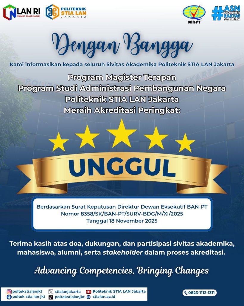 Program Magister Terapan APN Politeknik STIA LAN Jakarta resmi meraih akreditasi UNGGUL! Terima kasih atas dukungan semua pihak.