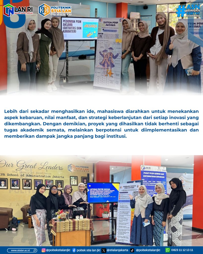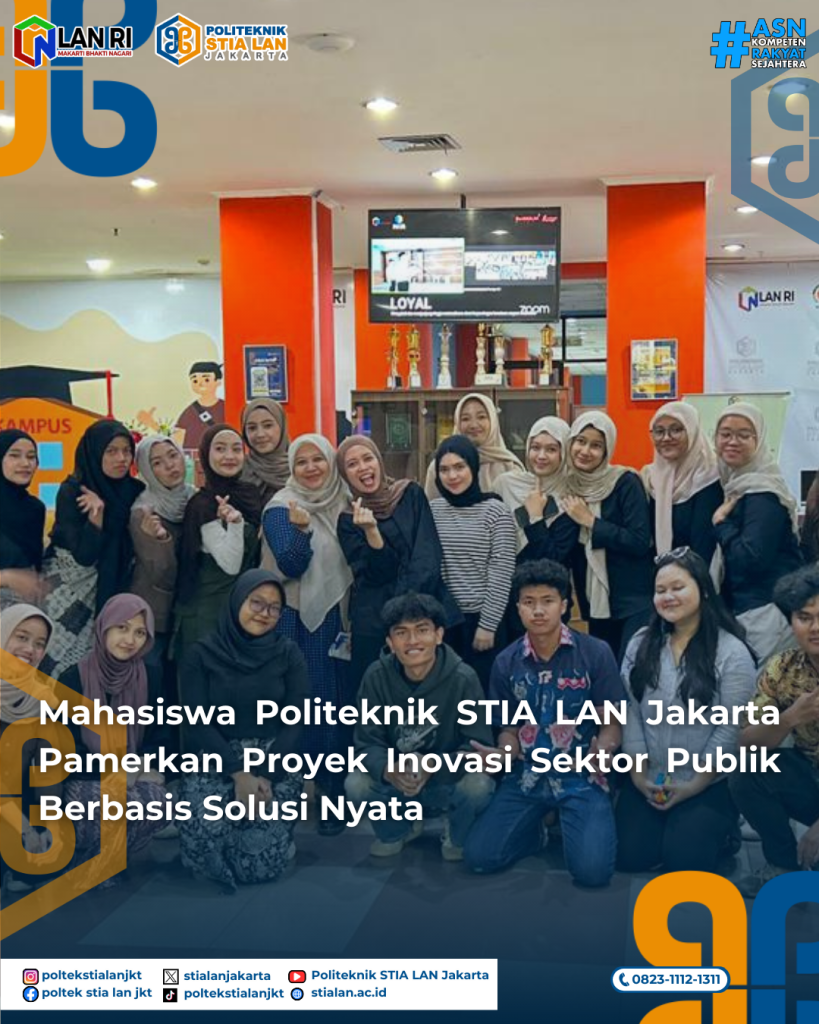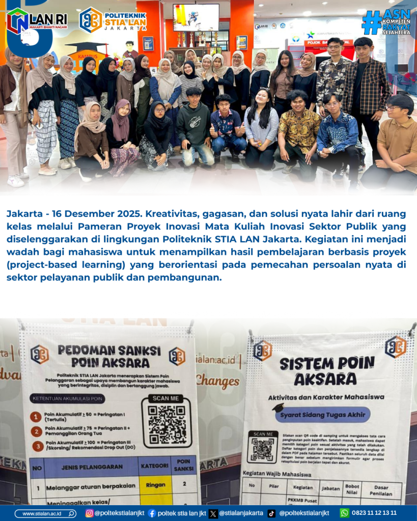Kreativitas, gagasan, dan solusi nyata lahir dari ruang kelas melalui Pameran Proyek Inovasi Mata Kuliah Inovasi Sektor Publik yang diselenggarakan di lingkungan Politeknik STIA LAN Jakarta. Kegiatan ini menjadi wadah bagi mahasiswa untuk menampilkan hasil pembelajaran berbasis proyek (project-based learning) yang berorientasi pada pemecahan persoalan nyata di sektor pelayanan publik dan pembangunan.