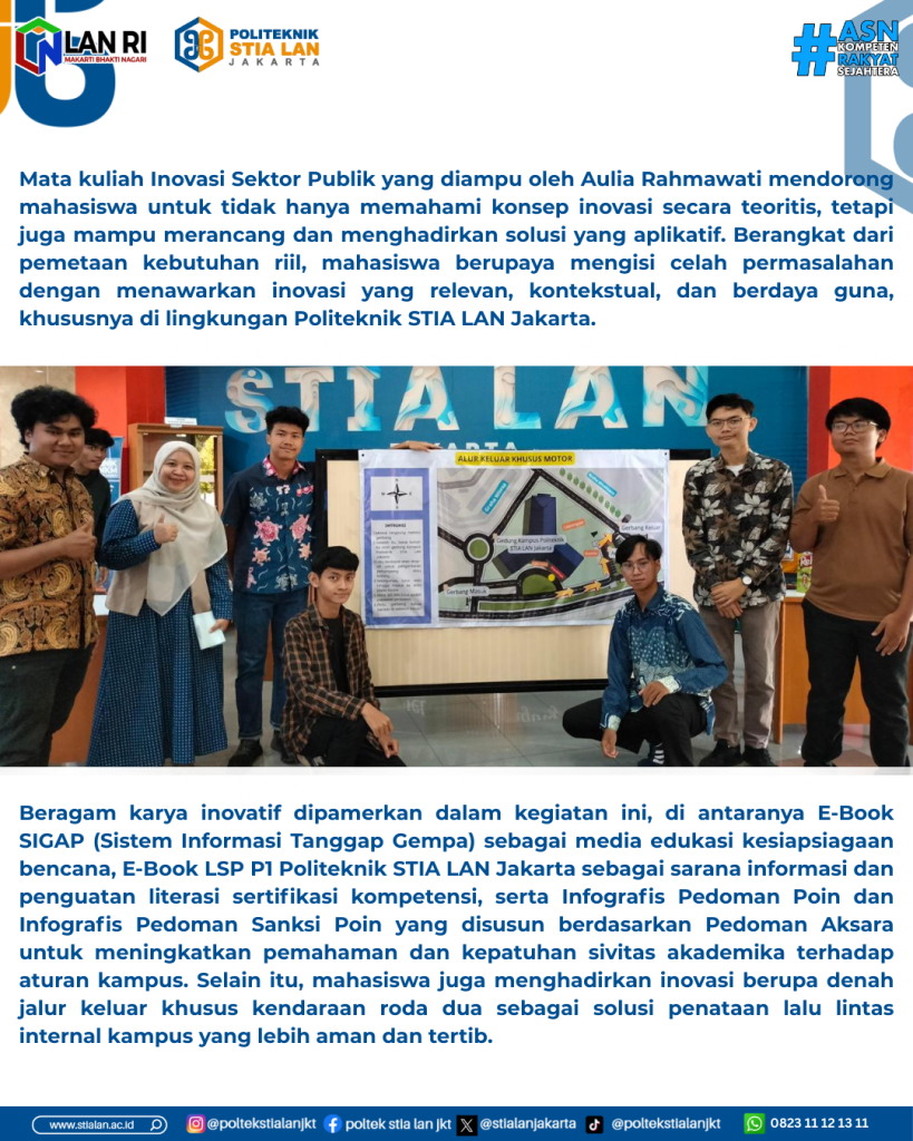 Mata kuliah Inovasi Sektor Publik yang diampu oleh Aulia Rahmawati mendorong mahasiswa untuk tidak hanya memahami konsep inovasi secara teoritis, tetapi juga mampu merancang dan menghadirkan solusi yang aplikatif. Berangkat dari pemetaan kebutuhan riil, mahasiswa berupaya mengisi celah permasalahan dengan menawarkan inovasi yang relevan, kontekstual, dan berdaya guna, khususnya di lingkungan Politeknik STIA LAN Jakarta.