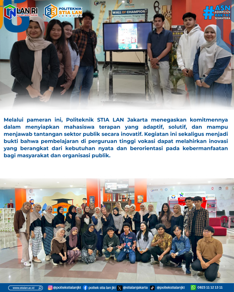 Melalui pameran ini, Politeknik STIA LAN Jakarta menegaskan komitmennya dalam menyiapkan mahasiswa terapan yang adaptif, solutif, dan mampu menjawab tantangan sektor publik secara inovatif. Kegiatan ini sekaligus menjadi bukti bahwa pembelajaran di perguruan tinggi vokasi dapat melahirkan inovasi yang berangkat dari kebutuhan nyata dan berorientasi pada kebermanfaatan bagi masyarakat dan organisasi publik.
