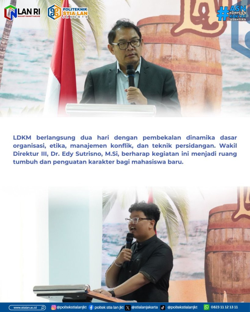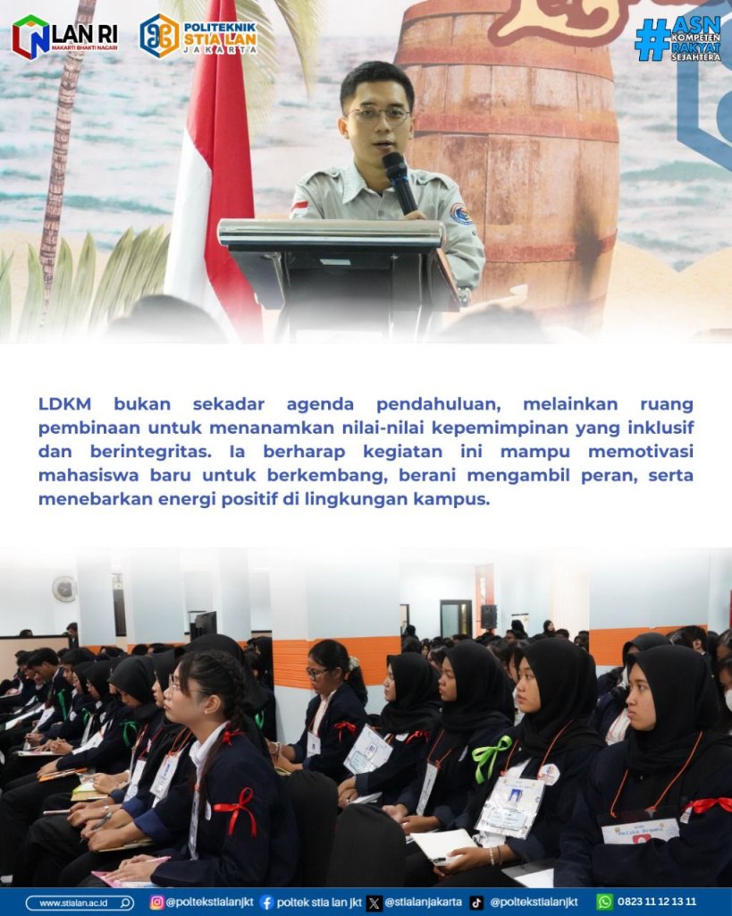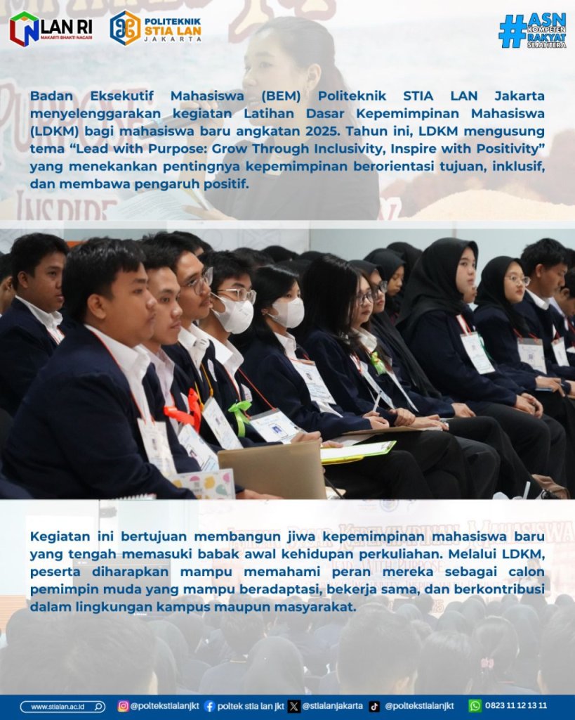 Jakarta, 21 November 2025 — Badan Eksekutif Mahasiswa (BEM) Politeknik STIA LAN Jakarta menyelenggarakan kegiatan Latihan Dasar Kepemimpinan Mahasiswa (LDKM) bagi mahasiswa baru angkatan 2025. Tahun ini, LDKM mengusung tema “Lead with Purpose: Grow Through Inclusivity, Inspire with Positivity” yang menekankan pentingnya kepemimpinan berorientasi tujuan, inklusif, dan membawa pengaruh positif.