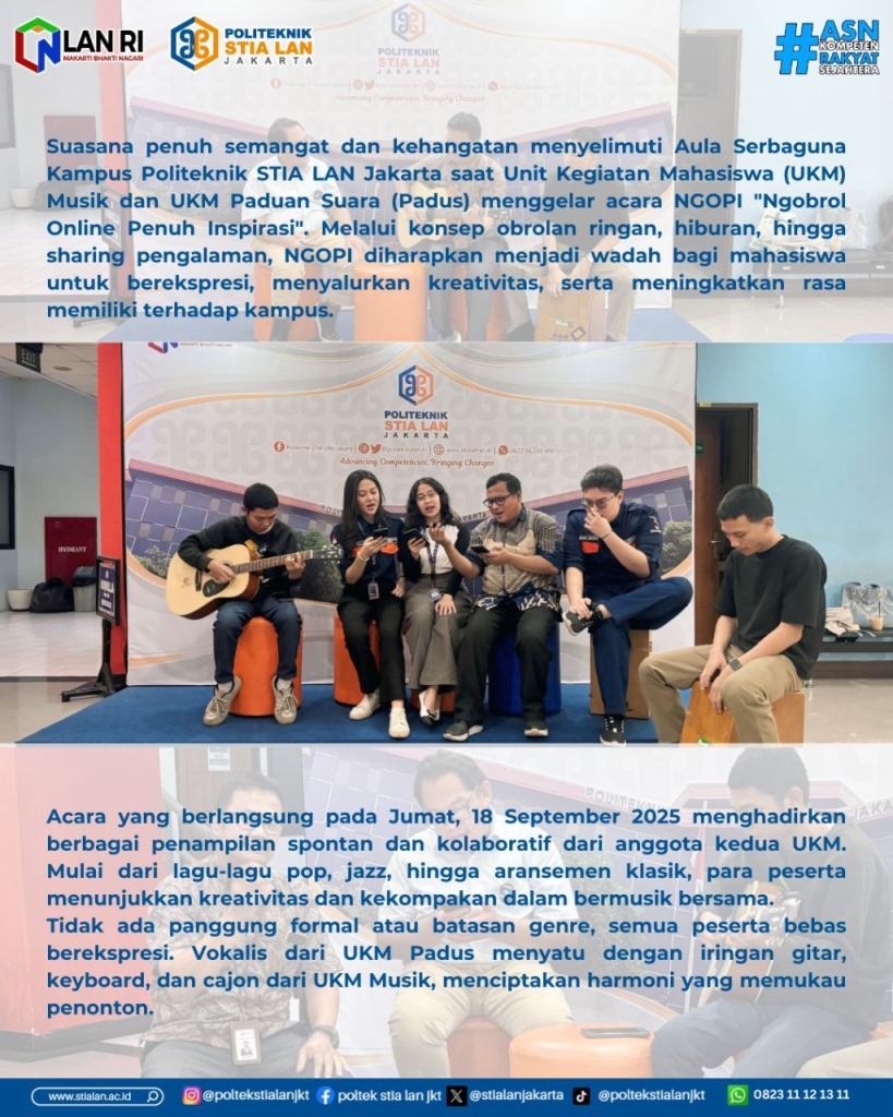 Jakarta, 18 September 2025 – Suasana penuh semangat dan kehangatan menyelimuti Aula Serbaguna Kampus Politeknik STIA LAN Jakarta saat Unit Kegiatan Mahasiswa (UKM) Musik dan UKM Paduan Suara (Padus) menggelar acara NGOPI “Ngobrol Online Penuh Inspirasi”.