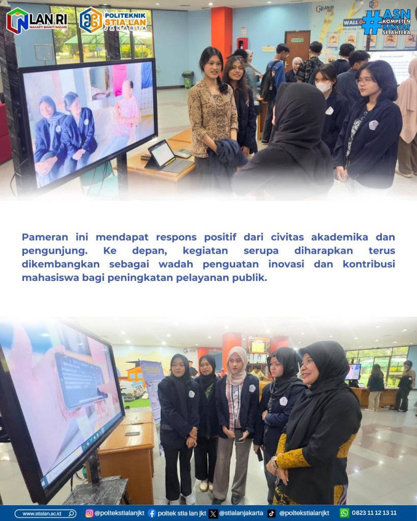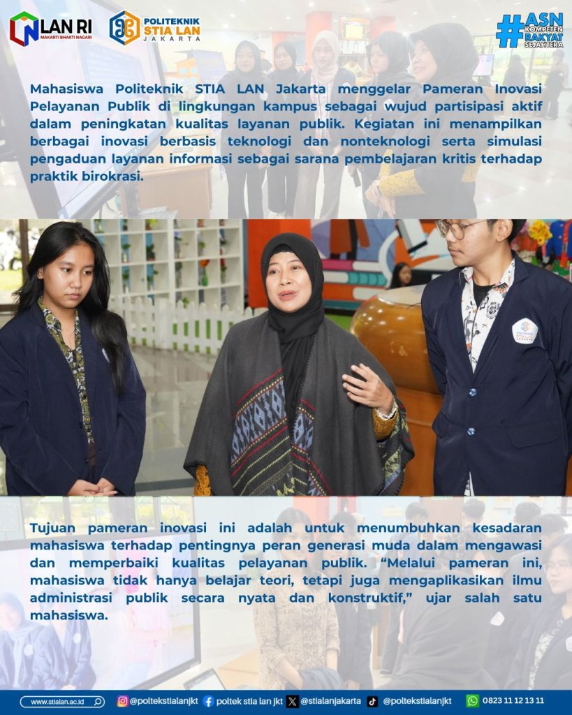 Jakarta, 18 Desember 2025 — Mahasiswa Politeknik Politeknik STIA LAN Jakarta menggelar Pameran Inovasi Pelayanan Publik sebagai bentuk partisipasi aktif mahasiswa dalam mendorong peningkatan kualitas pelayanan publik. Kegiatan ini diselenggarakan di lingkungan kampus Poltek.