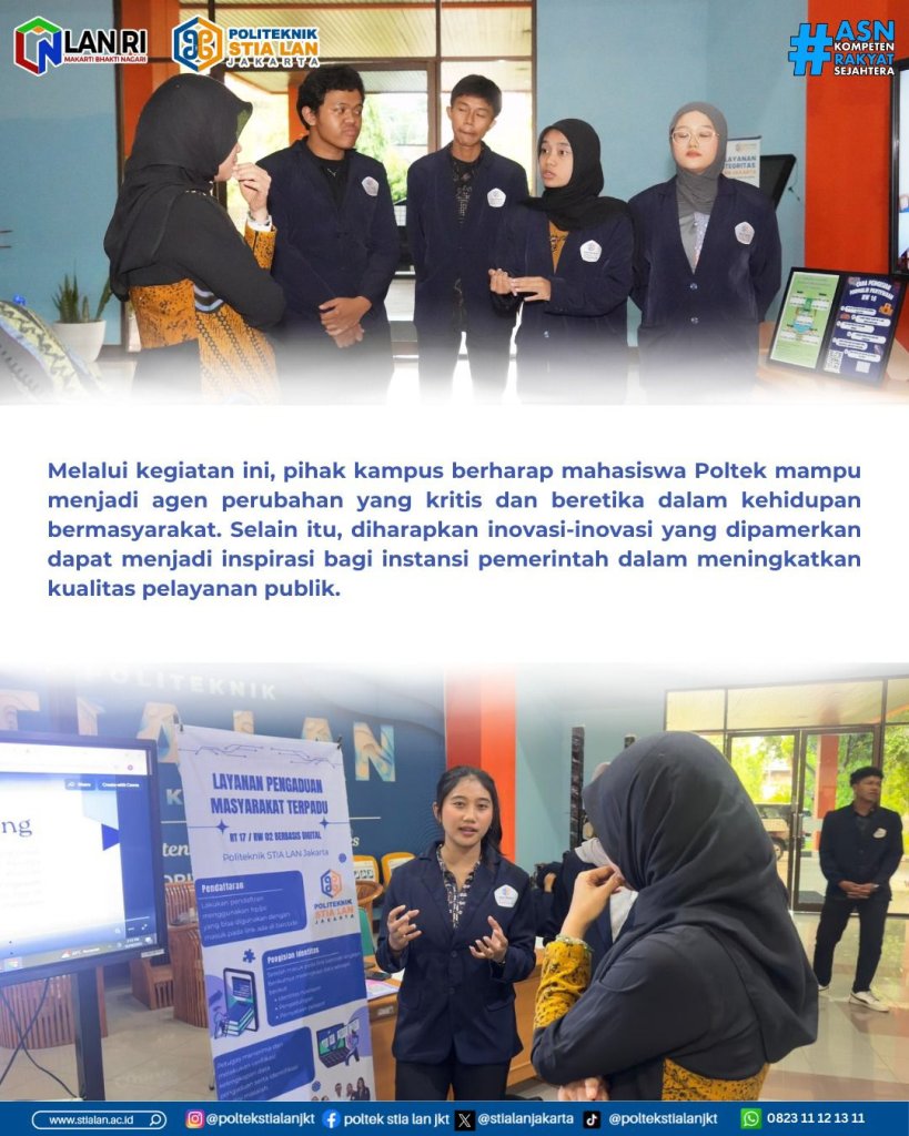 Melalui kegiatan ini, pihak kampus berharap mahasiswa Poltek mampu menjadi agen perubahan yang kritis dan beretika dalam kehidupan bermasyarakat. Selain itu, diharapkan inovasi-inovasi yang dipamerkan dapat menjadi inspirasi bagi instansi pemerintah dalam meningkatkan kualitas pelayanan publik.