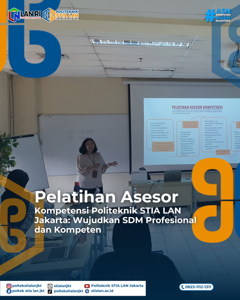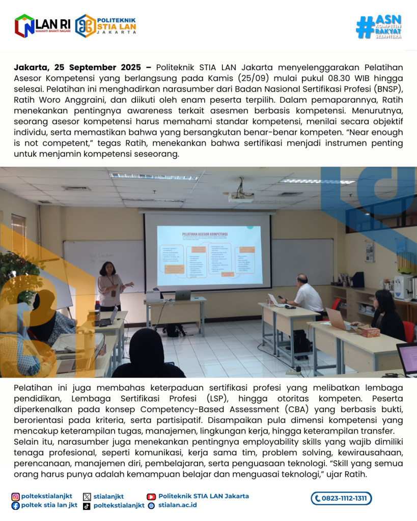 Jakarta, 25 September 2025 – Politeknik STIA LAN Jakarta menyelenggarakan Pelatihan Asesor Kompetensi yang berlangsung pada Kamis (25/09) mulai pukul 08.30 WIB hingga selesai. Pelatihan ini menghadirkan narasumber dari Badan Nasional Sertifikasi Profesi (BNSP), Ratih Woro Anggraini, dan diikuti oleh enam peserta terpilih. Kegiatan dicatat oleh notulis, Abiyyu Prishdian V.
