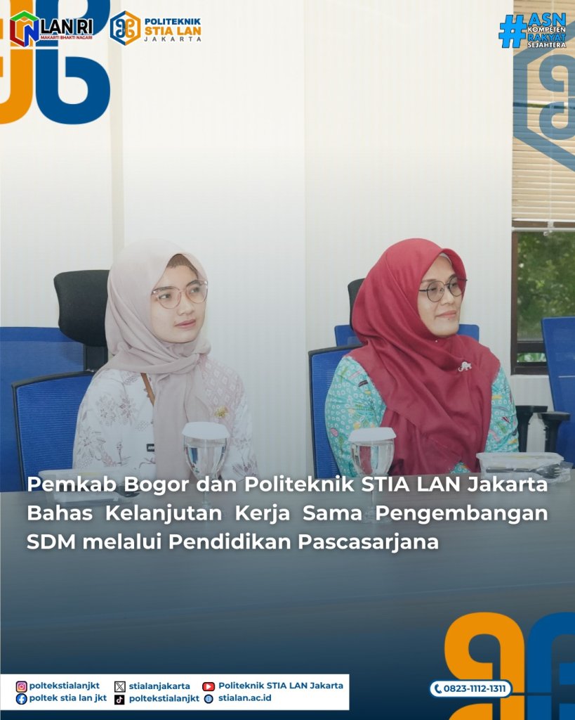 Dalam kesempatan yang sama, disampaikan pula bahwa untuk program doktor, Pemkab Bogor merencanakan kerja sama secara khusus dengan Politeknik STIA LAN Jakarta. Hal ini didasarkan pada kesesuaian bidang keilmuan, pengalaman institusi dalam pengembangan kapasitas aparatur negara, serta rekam jejak Politeknik STIA LAN Jakarta dalam penyelenggaraan pendidikan vokasi dan terapan di bidang administrasi dan kebijakan publik.