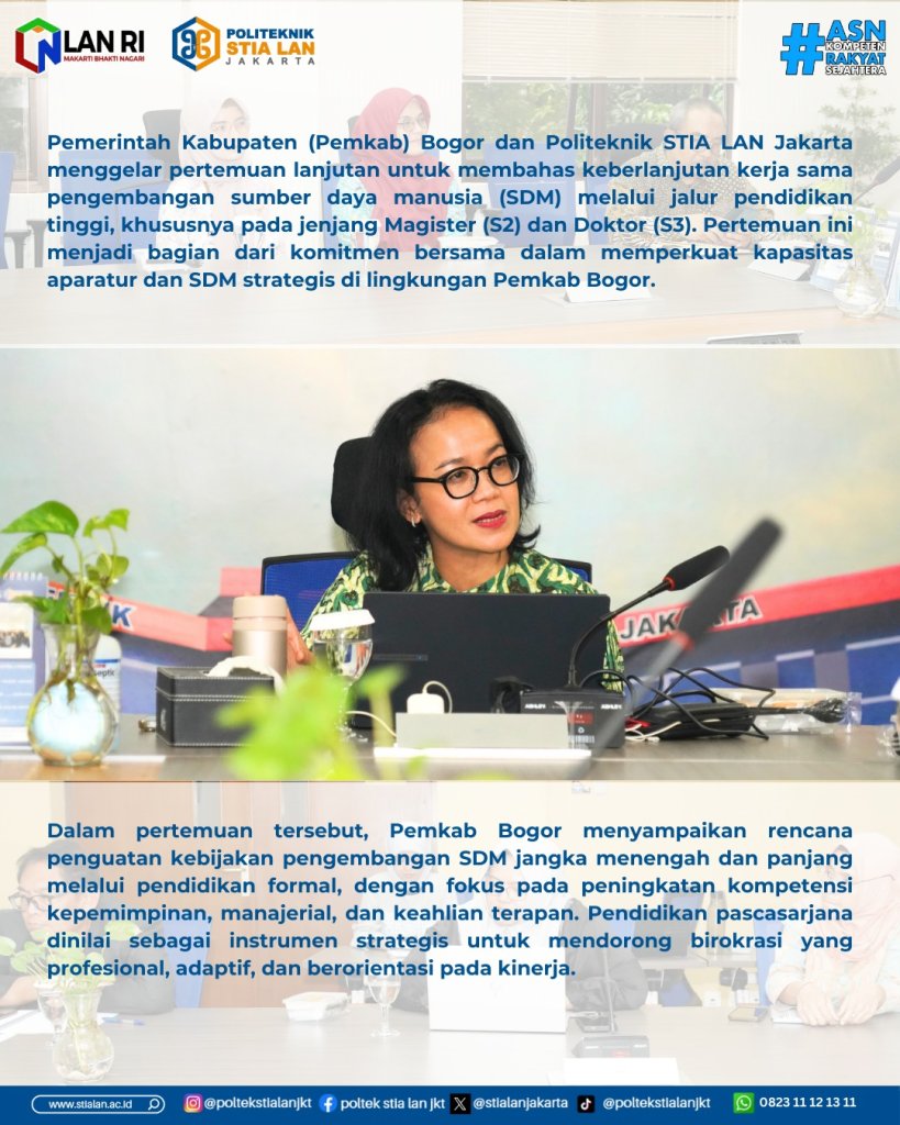 Bogor, 22 Januari 2026 — Pemerintah Kabupaten (Pemkab) Bogor dan Politeknik STIA LAN Jakarta menggelar pertemuan lanjutan untuk membahas keberlanjutan kerja sama pengembangan sumber daya manusia (SDM) melalui jalur pendidikan tinggi, khususnya pada jenjang Magister (S2) dan Doktor (S3). Pertemuan ini menjadi bagian dari komitmen bersama dalam memperkuat kapasitas aparatur dan SDM strategis di lingkungan Pemkab Bogor.