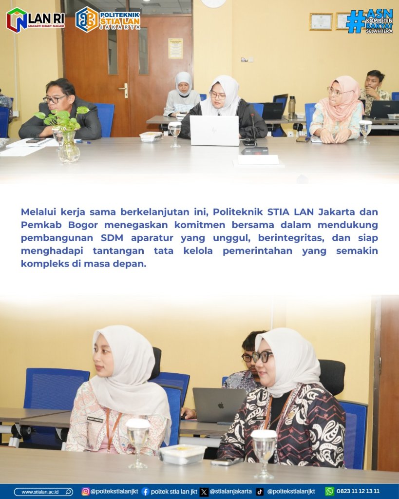 Melalui kerja sama berkelanjutan ini, Politeknik STIA LAN Jakarta dan Pemkab Bogor menegaskan komitmen bersama dalam mendukung pembangunan SDM aparatur yang unggul, berintegritas, dan siap menghadapi tantangan tata kelola pemerintahan yang semakin kompleks di masa depan.