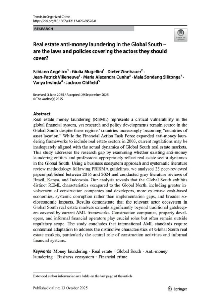 Selain kegiatan simposium dan forum diseminasi tersebut, hingga saat ini proyek Corruption in Paradise juga telah menghasilkan luaran publikasi internasional pada jurnal Trends in Organized Crime yang terindeks Scopus Q1, berjudul “Real estate anti-money laundering in the Global South: Are the laws and policies covering the actors they should cover?”. Artikel tersebut terbit pada 13 Oktober 2025 sebagai artikel open access dan menjadi salah satu capaian penting dari kolaborasi riset ini dalam memperkuat kontribusi akademik Global South terhadap isu anti-pencucian uang di sektor real estate. Artikel dapat diakses melalui tautan berikut: https://link.springer.com/article/10.1007/s12117-025-09578-0