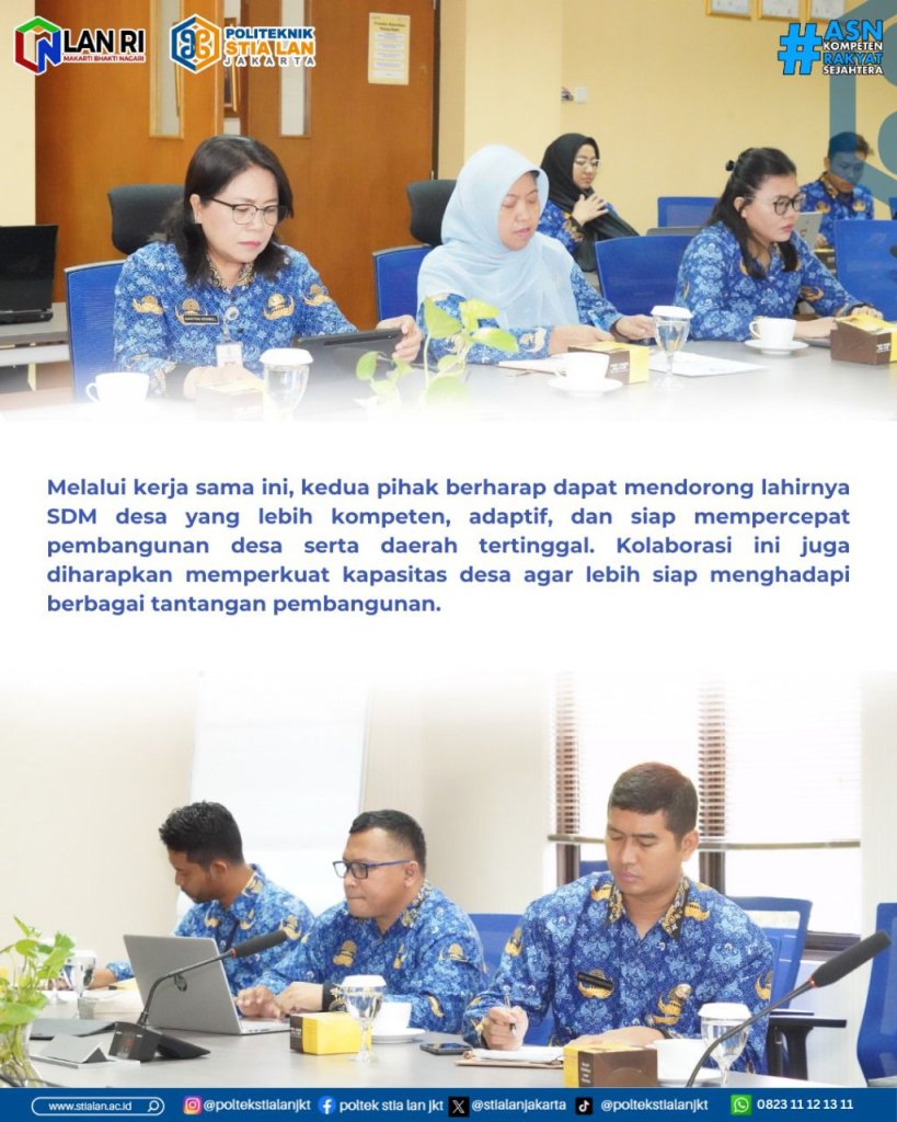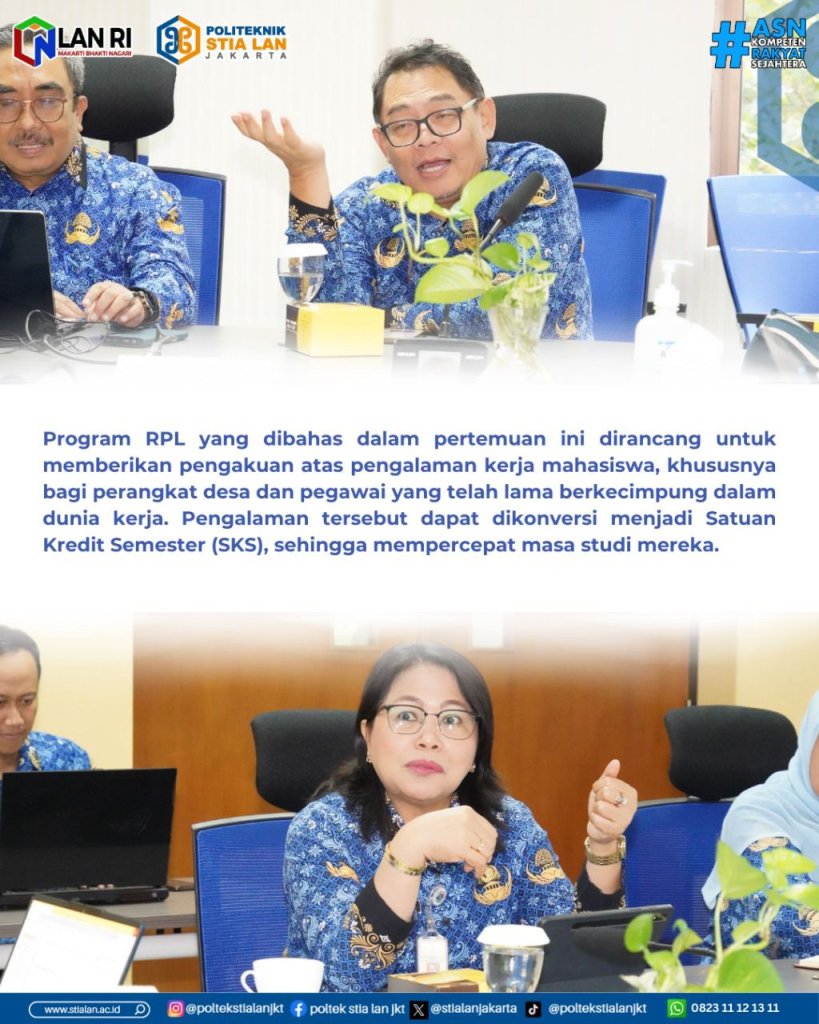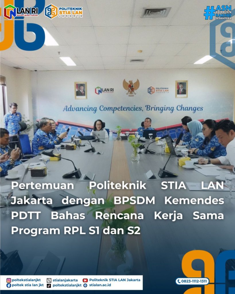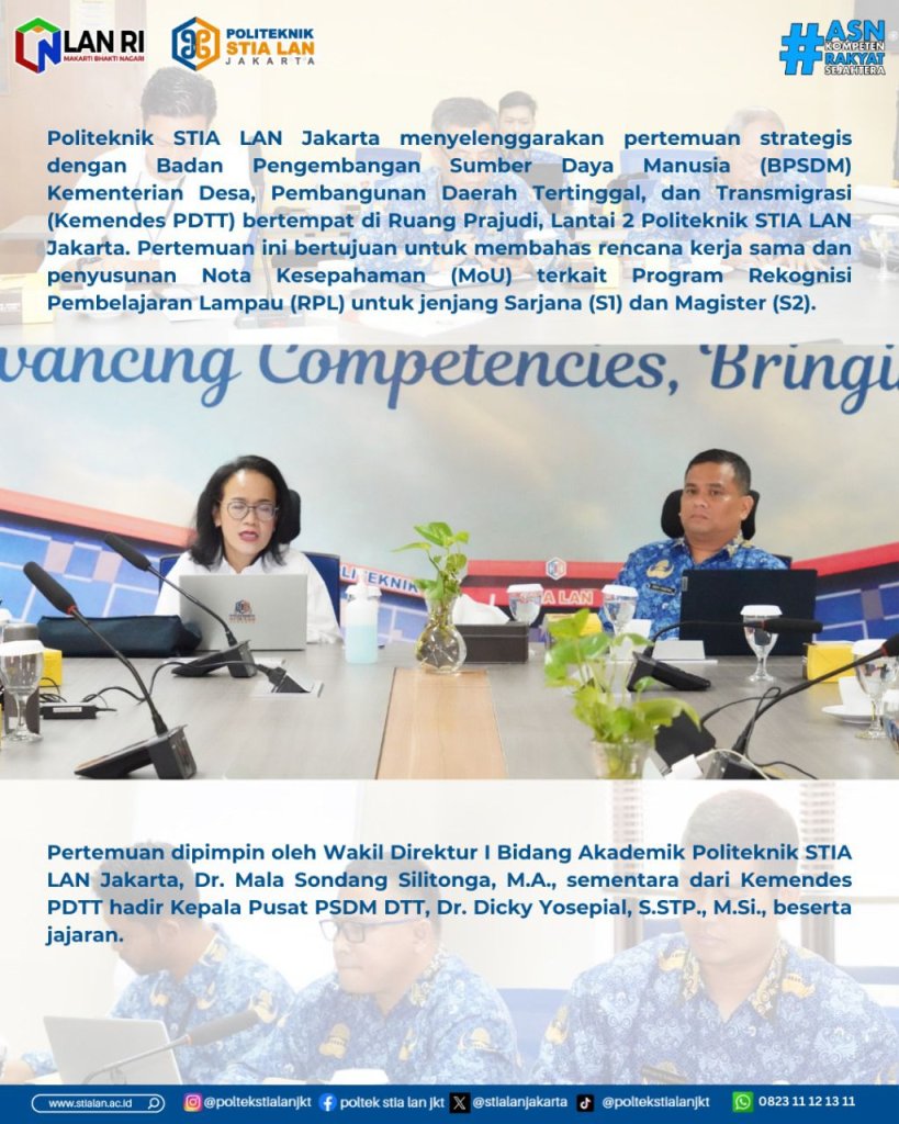 Jakarta, Senin, 1 Desember 2025 — Politeknik STIA LAN Jakarta menyelenggarakan pertemuan strategis dengan Badan Pengembangan Sumber Daya Manusia (BPSDM) Kementerian Desa, Pembangunan Daerah Tertinggal, dan Transmigrasi (Kemendes PDTT) bertempat di Ruang Prajudi, Lantai 2 Politeknik STIA LAN Jakarta. Pertemuan ini bertujuan untuk membahas rencana kerja sama dan penyusunan Nota Kesepahaman (MoU) terkait Program Rekognisi Pembelajaran Lampau (RPL) untuk jenjang Sarjana (S1) dan Magister (S2).