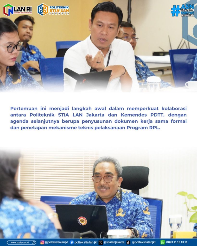 Pertemuan ini menjadi langkah awal dalam memperkuat kolaborasi antara Politeknik STIA LAN Jakarta dan Kemendes PDTT, dengan agenda selanjutnya berupa penyusunan dokumen kerja sama formal dan penetapan mekanisme teknis pelaksanaan Program RPL.