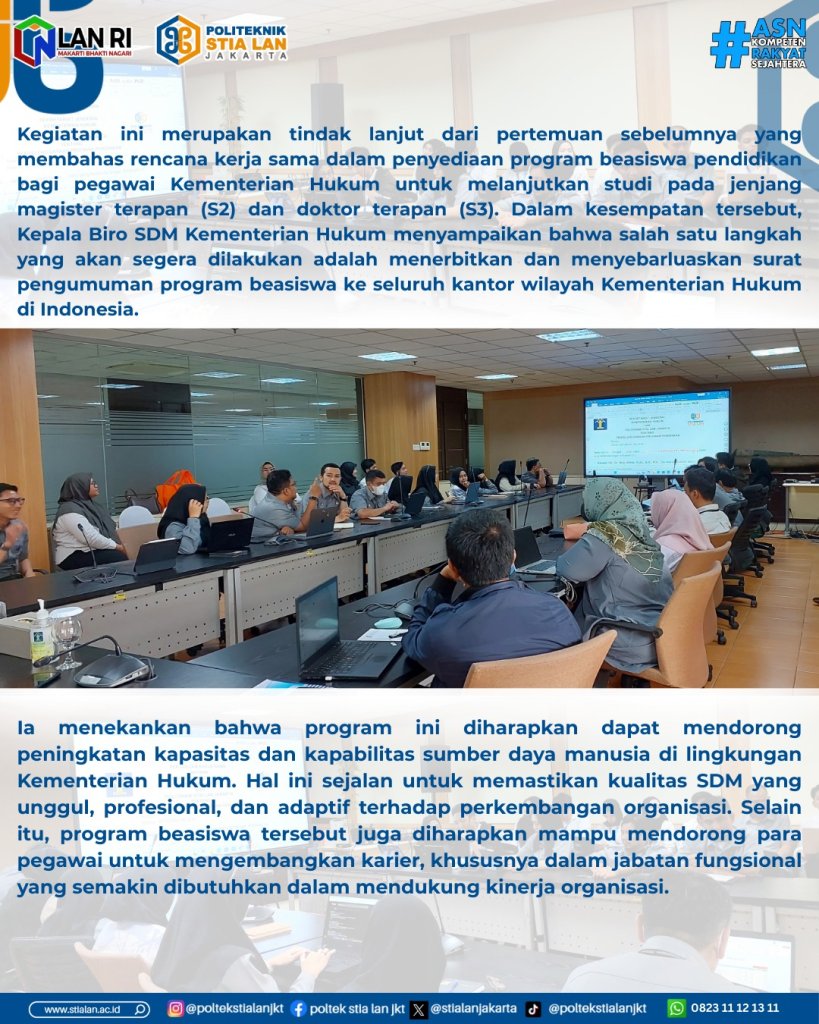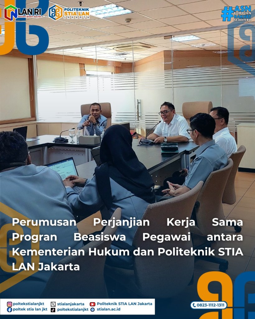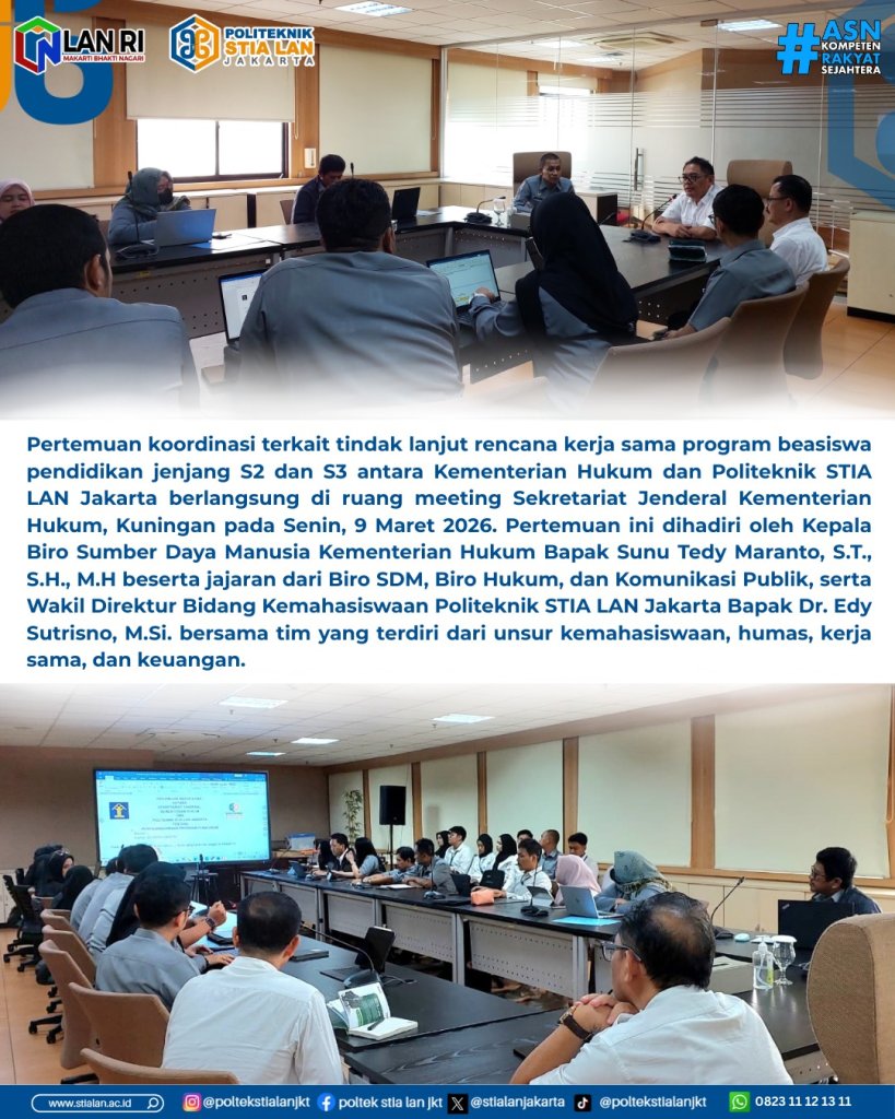 Jakarta, 9 Maret 2026 – Pertemuan koordinasi terkait tindak lanjut rencana kerja sama program beasiswa pendidikan jenjang S2 dan S3 antara Kementerian Hukum dan Politeknik STIA LAN Jakarta berlangsung di ruang meeting Sekretariat Jenderal Kementerian Hukum, Kuningan.