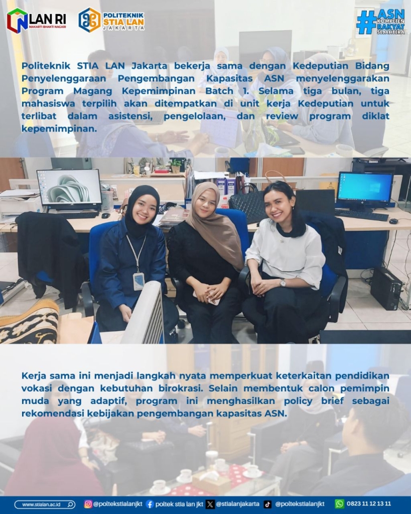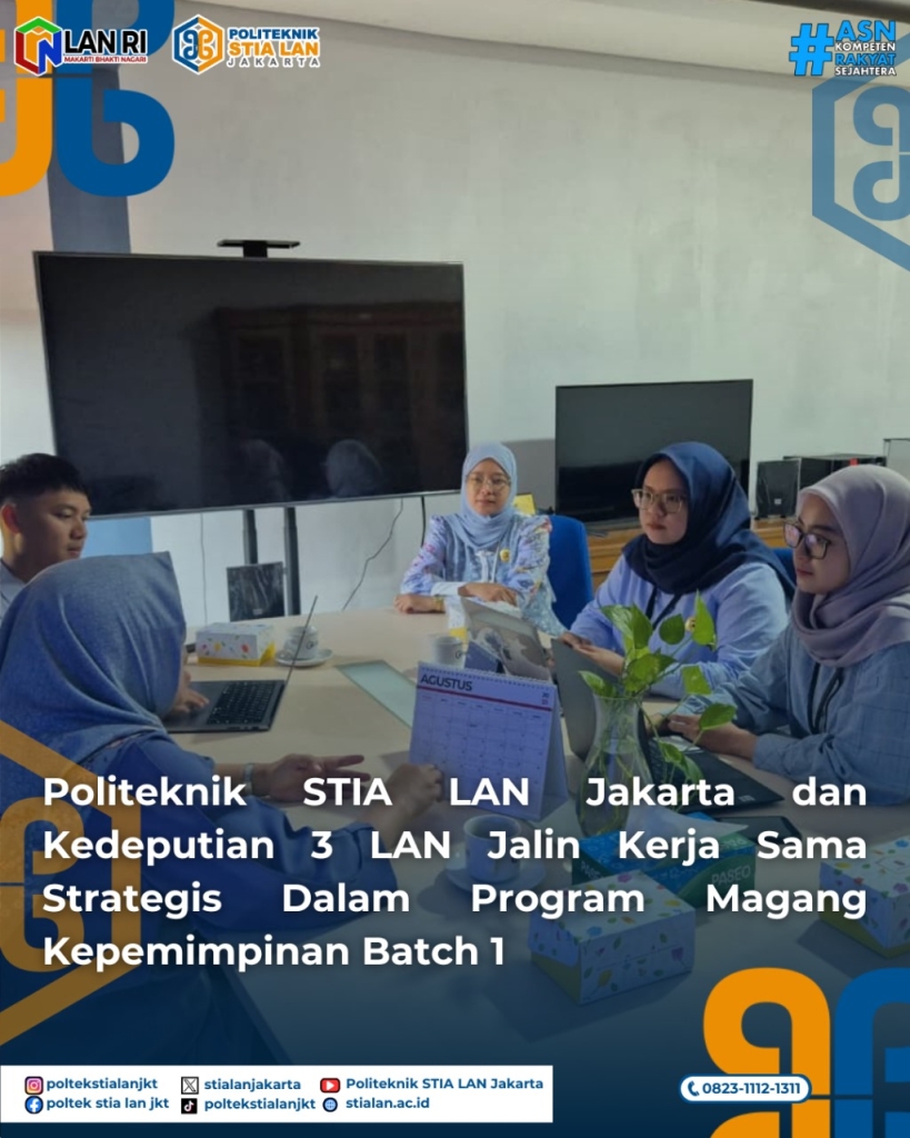 Jakarta, 17 September 2025 – Dalam rangka meningkatkan kapasitas kepemimpinan generasi muda, Politeknik STIA LAN Jakarta menjalin kerja sama strategis dengan Kedeputian Bidang Penyelenggaraan Pengembangan Kapasitas ASN untuk menyelenggarakan Program Magang Kepemimpinan Batch 1. Program ini bertujuan memberikan pengalaman langsung kepada mahasiswa dalam memahami proses kepemimpinan dan tata kelola pemerintahan di lingkungan birokrasi.