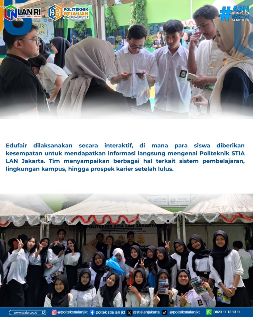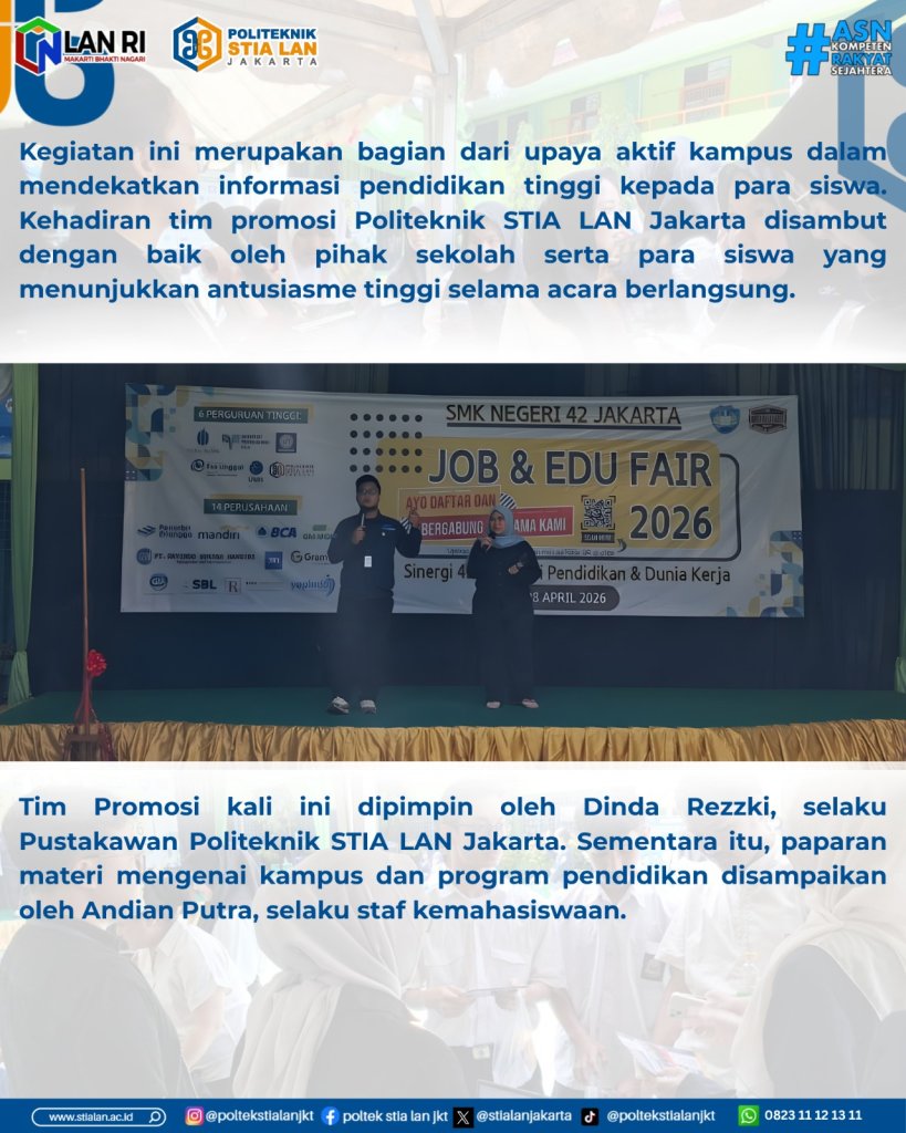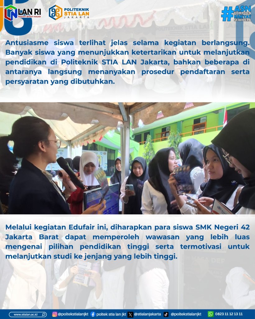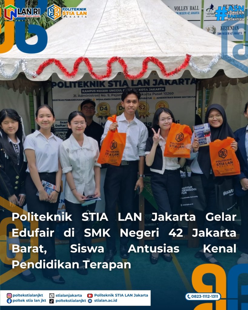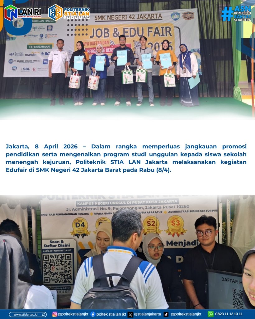 Jakarta, 8 April 2026 – Dalam rangka memperluas jangkauan promosi pendidikan serta mengenalkan program studi unggulan kepada siswa sekolah menengah kejuruan, Politeknik STIA LAN Jakarta melaksanakan kegiatan Edufair di SMK Negeri 42 Jakarta Barat pada Rabu (8/4).