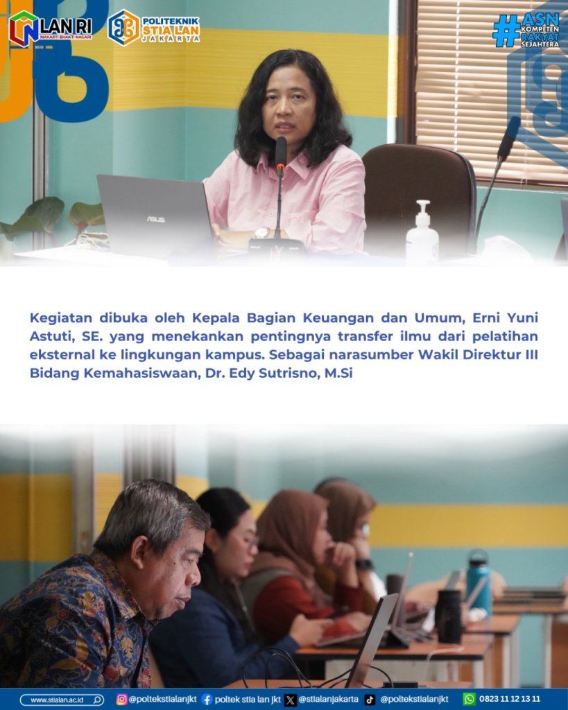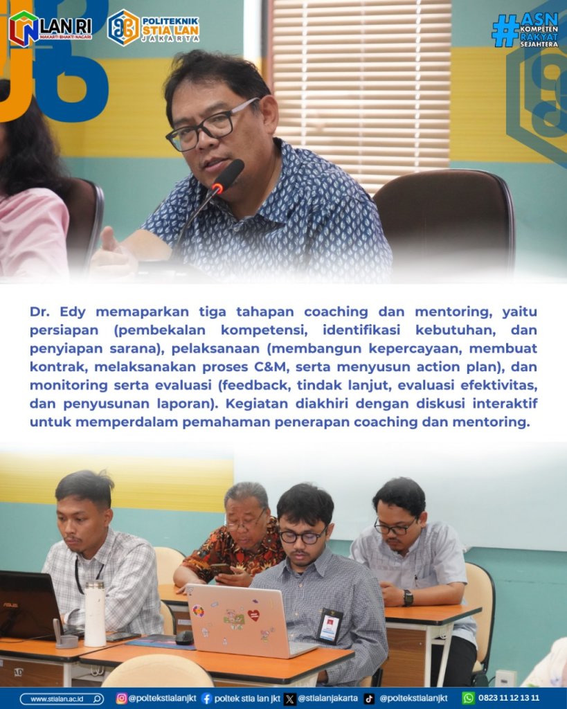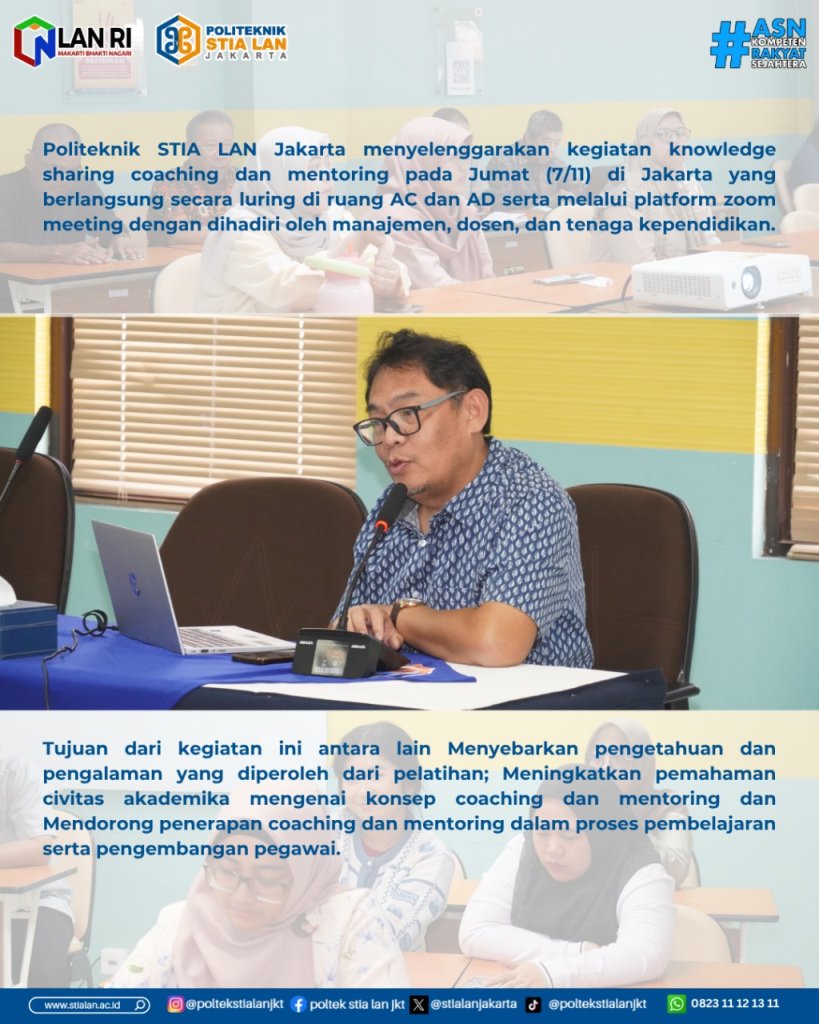 Jakarta, 7 November 2025 – Politeknik STIA LAN Jakarta menyelenggarakan kegiatan knowledge sharing coaching dan mentoring pada Jumat (7/11) di Jakarta yang berlangsung secara luring di ruang AC dan AD serta melalui platform zoom meeting dengan dihadiri oleh manajemen, dosen, dan tenaga kependidikan.