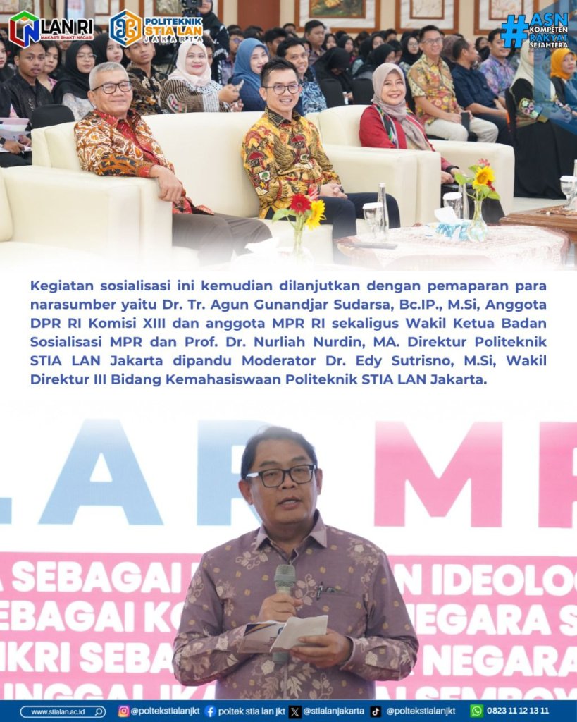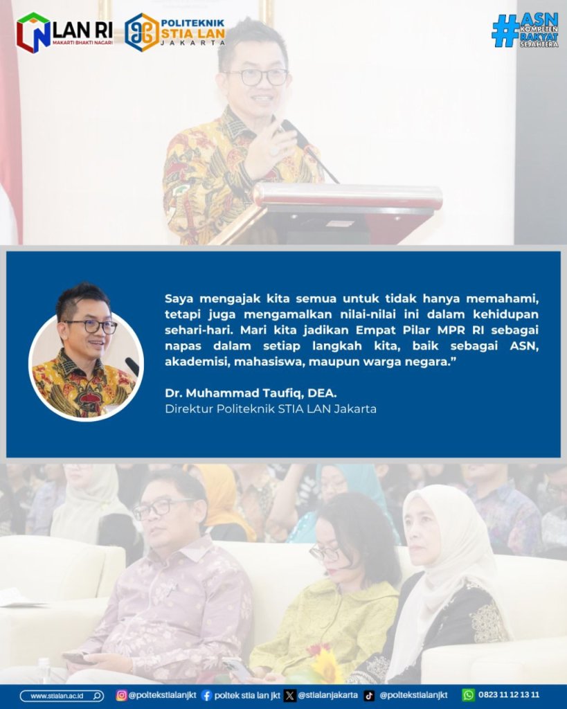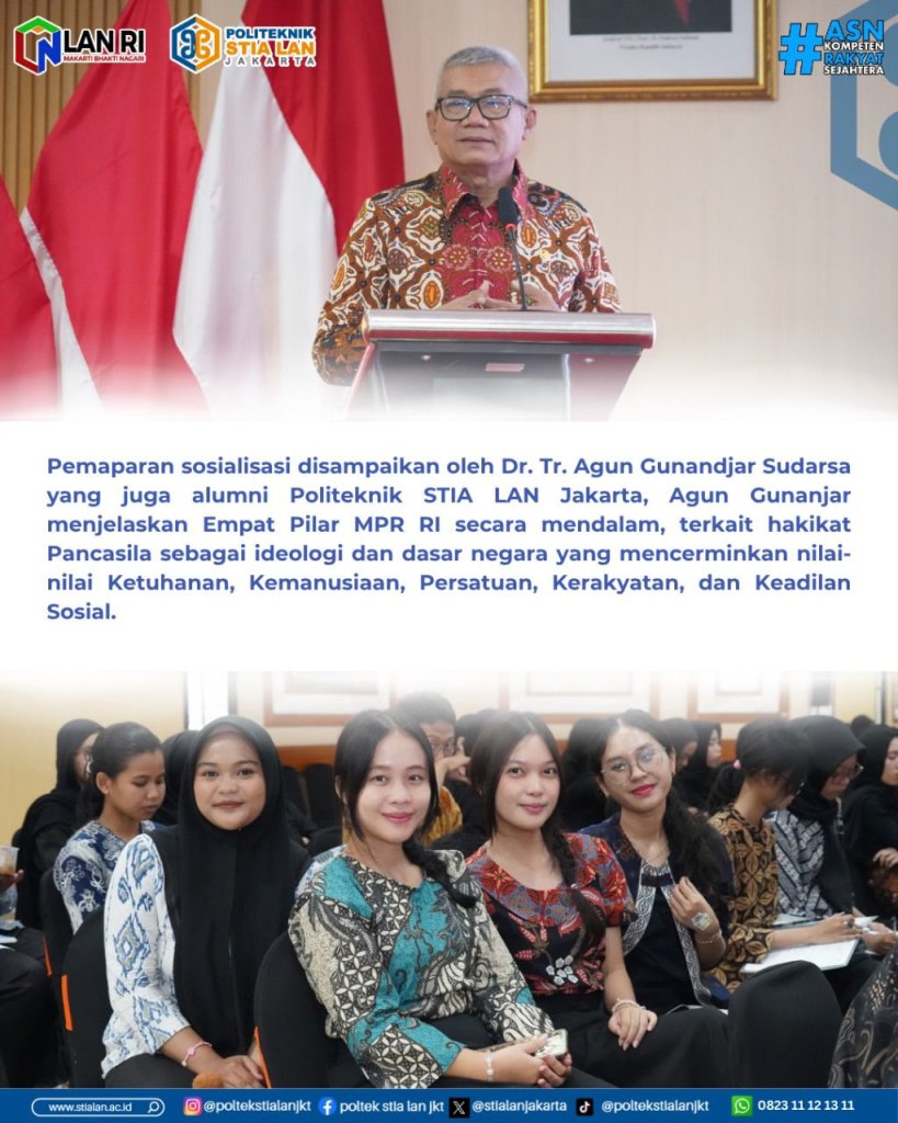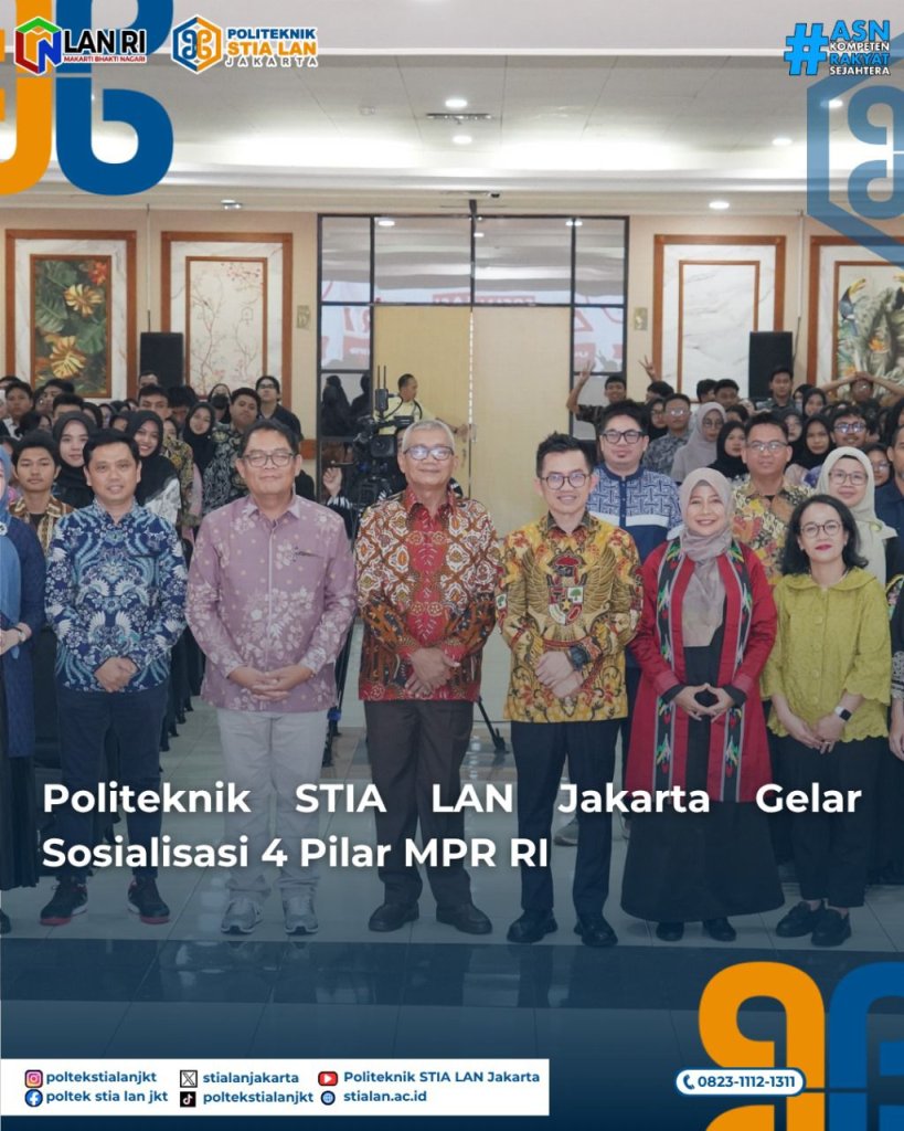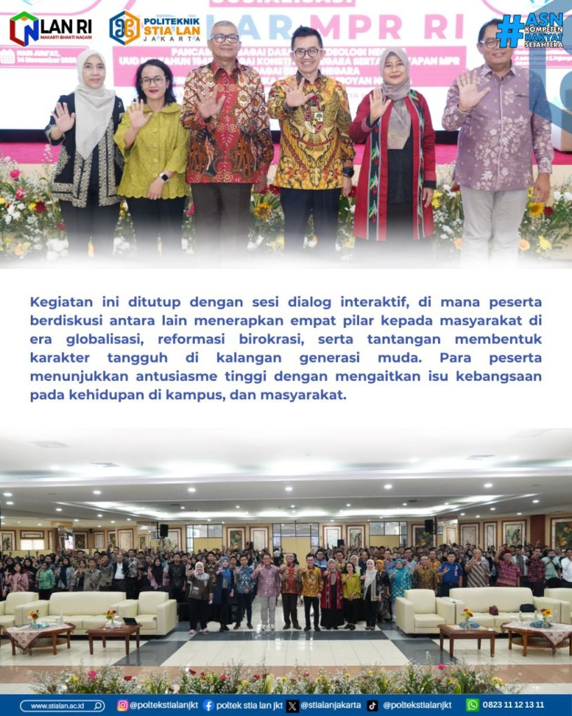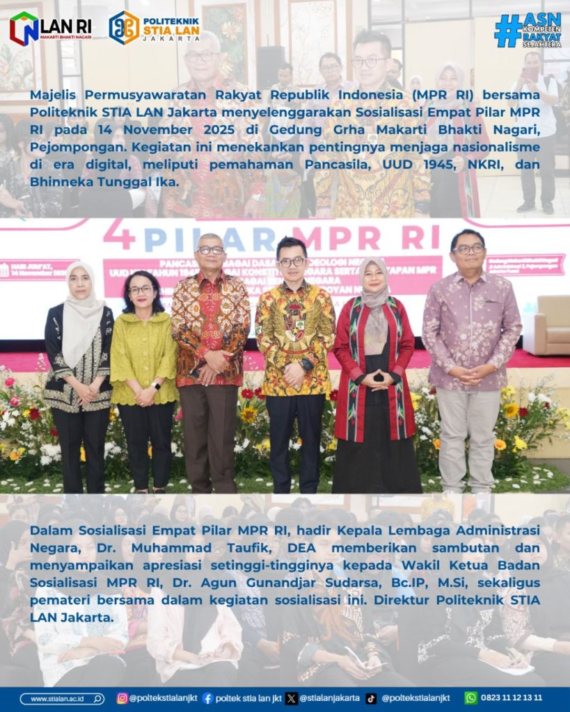 Jakarta, 14 November 2025 – Dalam rangka memperkuat semangat kebangsaan, Majelis Permusyawaratan Rakyat Republik Indonesia (MPR RI) bekerjasama Politeknik STIA LAN Jakarta menggelar kegiatan Sosialisasi Empat Pilar MPR RI dengan menekankan pentingnya menjaga nasionalisme di Era Digitalisasi Teknologi pada 14 November 2025 bertempat di Gedung Grha Makarti Bhakti Nagari Lantai, Pejompongan Jakarta. Empat pilar yang dimaksud meliputi Pancasila sebagai Dasar dan Ideologi Negara, UUD 1945 sebagai Konstitusi Negara, Negara Kesatuan Republik Indonesia (NKRI) sebagai Bentuk Negara; dan Bhinneka Tunggal Ika sebagai Semboyan Negara.