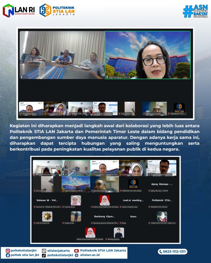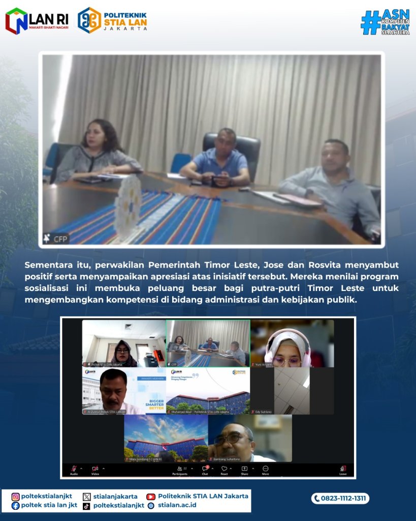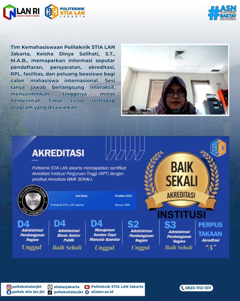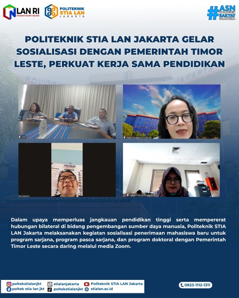 Jakarta, 6 April 2026 – Dalam upaya memperluas jangkauan pendidikan tinggi serta mempererat hubungan bilateral di bidang pengembangan sumber daya manusia, Politeknik STIA LAN Jakarta melaksanakan kegiatan sosialisasi penerimaan mahasiswa baru untuk program sarjana, program pasca sarjana, dan program doktoral dengan Pemerintah Timor Leste secara daring melalui media Zoom.