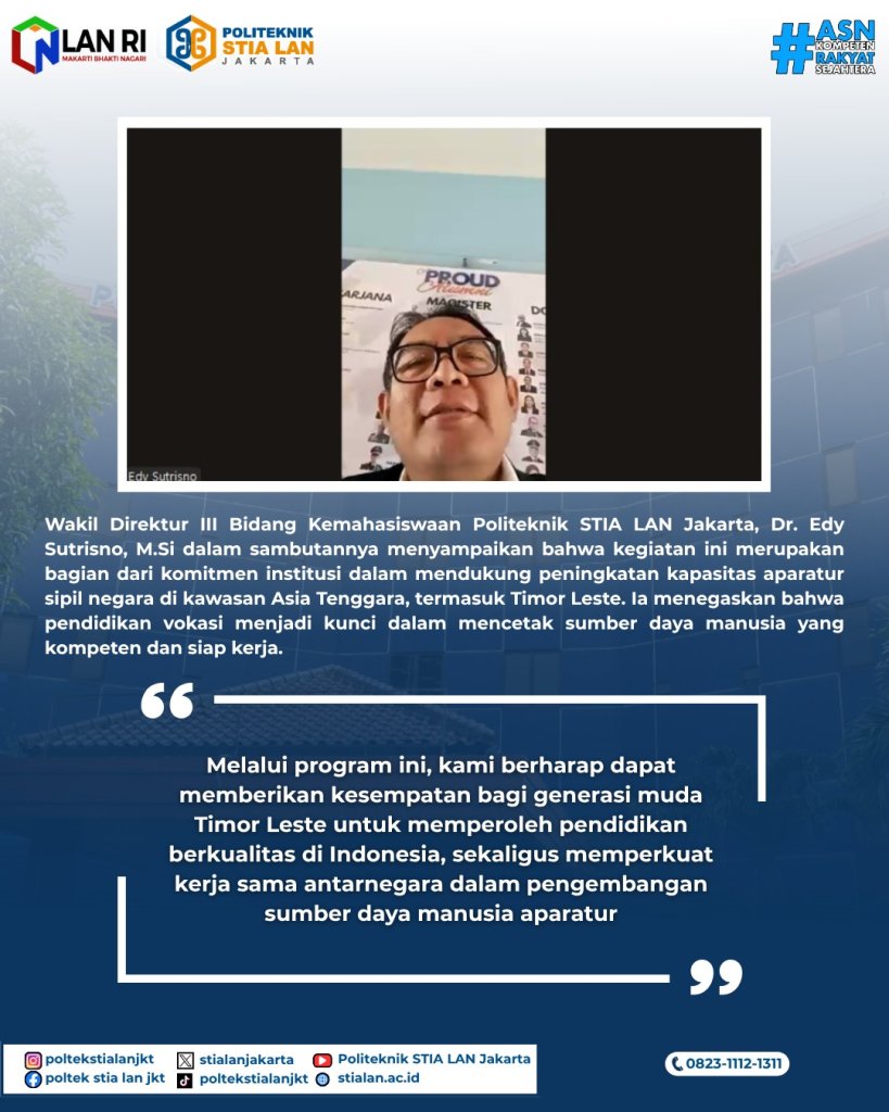 Wakil Direktur III Bidang Kemahasiswaan Politeknik STIA LAN Jakarta, Dr. Edy Sutrisno, M.Si dalam sambutannya menyampaikan bahwa kegiatan ini merupakan bagian dari komitmen institusi dalam mendukung peningkatan kapasitas aparatur sipil negara di kawasan Asia Tenggara, termasuk Timor Leste. Ia menegaskan bahwa pendidikan vokasi menjadi kunci dalam mencetak sumber daya manusia yang kompeten dan siap kerja.