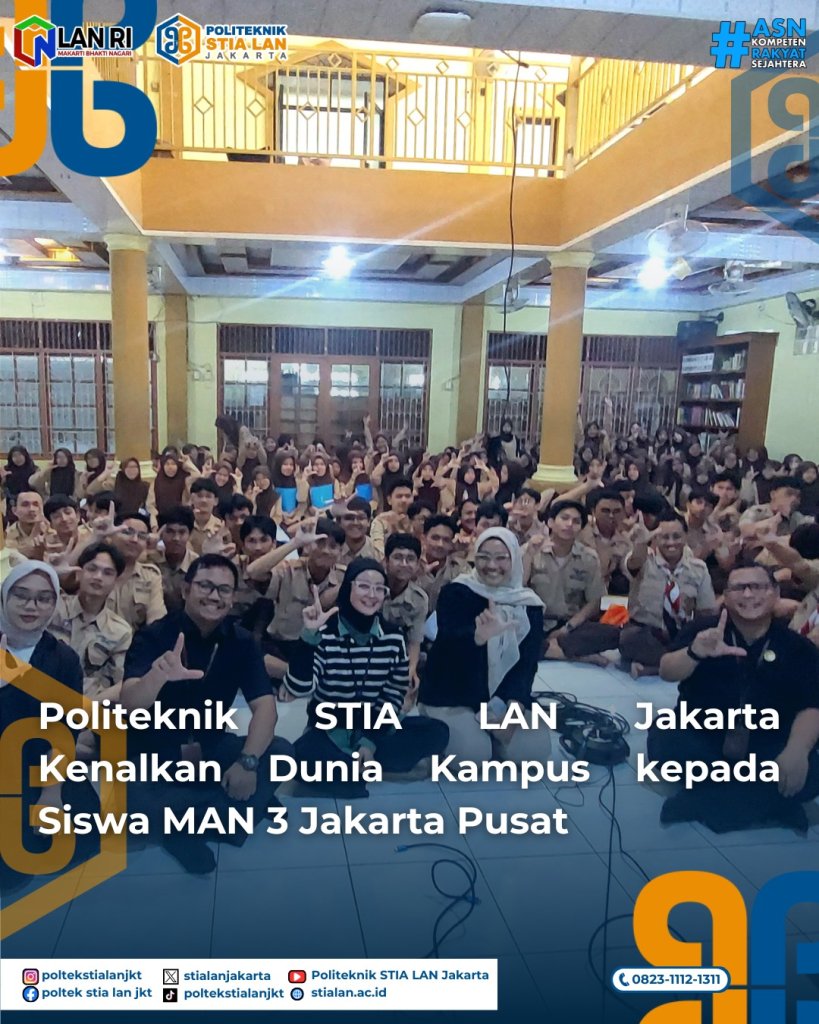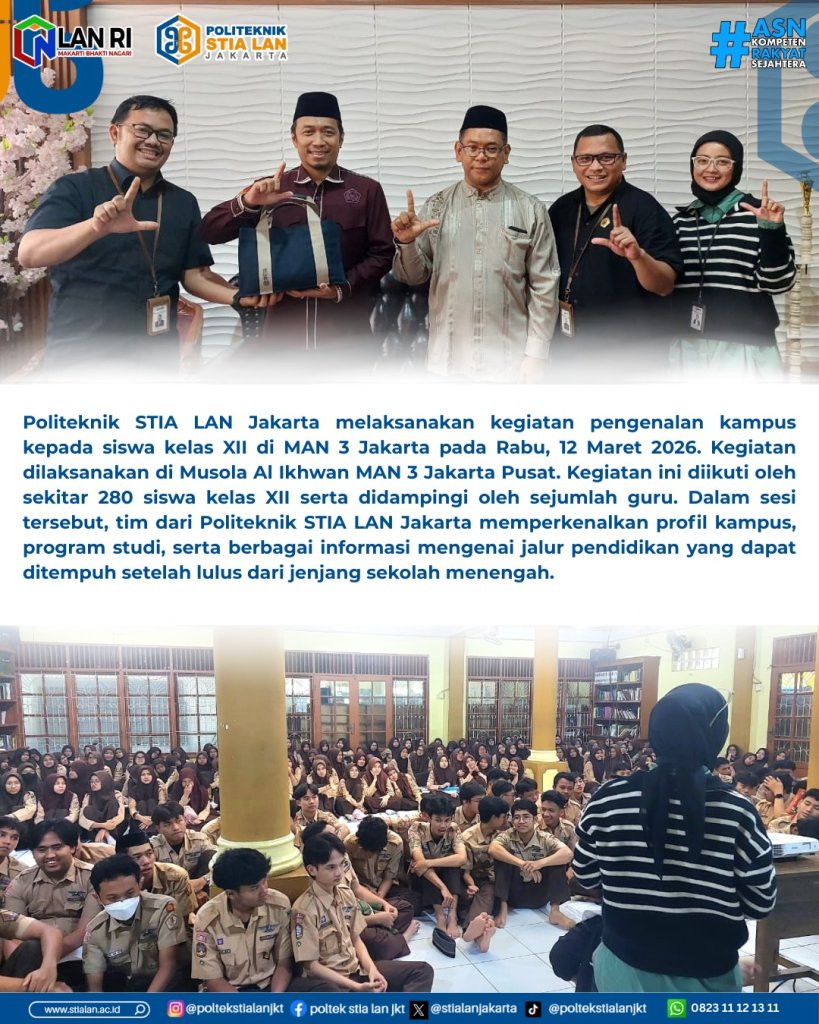 Politeknik STIA LAN Jakarta melaksanakan kegiatan pengenalan kampus kepada siswa kelas XII – MAN 3 Jakarta pusat, Rabu (11/ 3). Kegiatan dilaksanakan di Musola Al Ikhwan MAN 3 Jakarta Pusat.