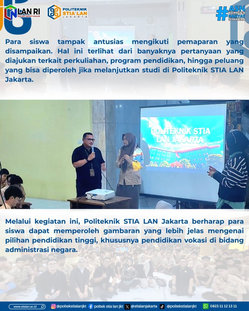 Kegiatan ini diikuti oleh sekitar 280 siswa kelas XII serta didampingi oleh sejumlah guru. Dalam sesi tersebut, tim dari Politeknik STIA LAN Jakarta memperkenalkan profil kampus, program studi, serta berbagai informasi mengenai jalur pendidikan yang dapat ditempuh setelah lulus dari jenjang sekolah menengah.