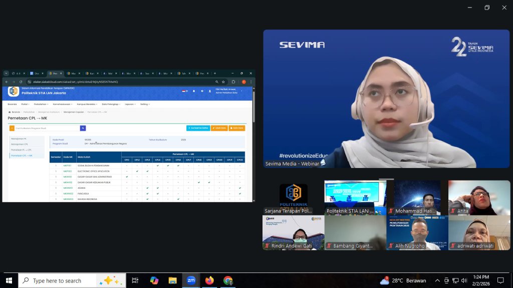 Jakarta, 2 Februari 2026 — Politeknik STIA LAN Jakarta terus menunjukkan komitmennya dalam meningkatkan mutu pendidikan terapan melalui pelaksanaan Bimbingan Teknis Implementasi Outcome-Based Education (OBE) pada Sistem Informasi Pendidikan Terapan, yang digelar pada Senin, 2 Februari 2026.