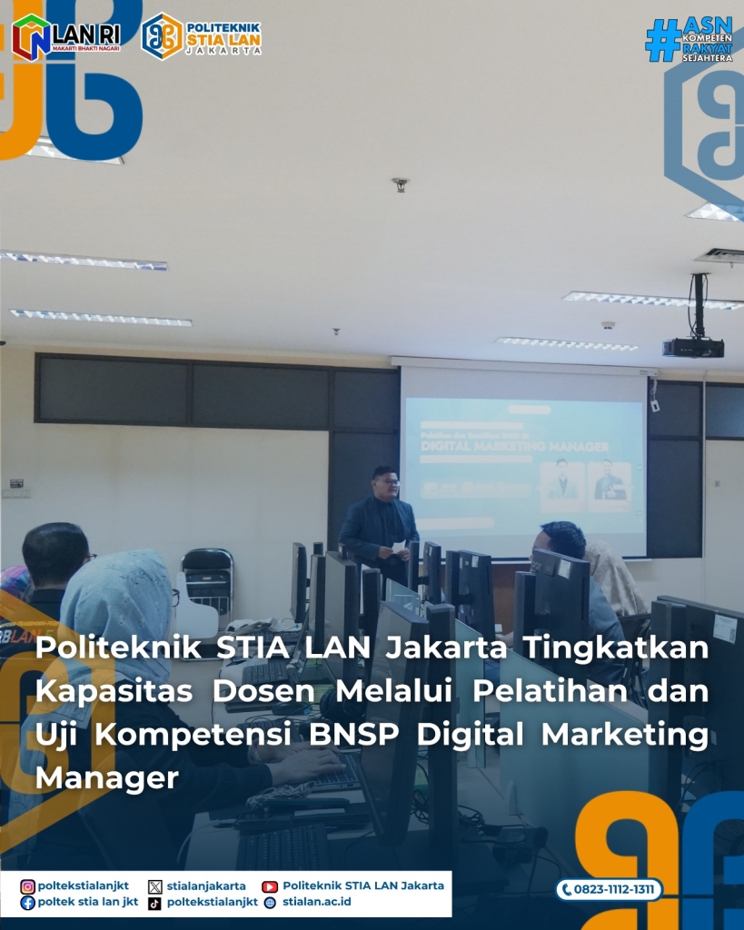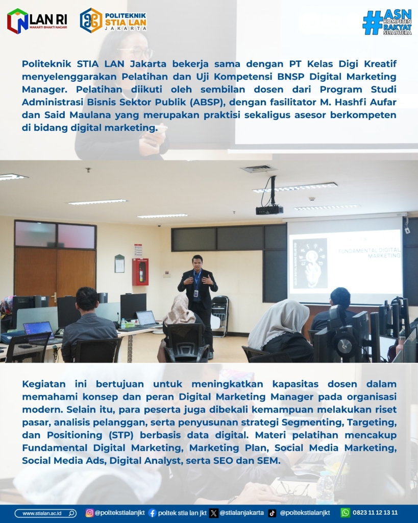 Jakarta, 29 Oktober 2025 – Politeknik STIA LAN Jakarta bekerja sama dengan PT Kelas Digi Kreatif menyelenggarakan Pelatihan dan Uji Kompetensi BNSP Digital Marketing Manager. Kegiatan yang berlangsung selama tiga hari, mulai 29 hingga 31 Oktober 2025, bertempat di kampus Politeknik STIA LAN Jakarta, dan dibuka secara resmi oleh Dr. Mala Sondang Silitonga, M.A., selaku Wakil Direktur I Bidang Akademik.