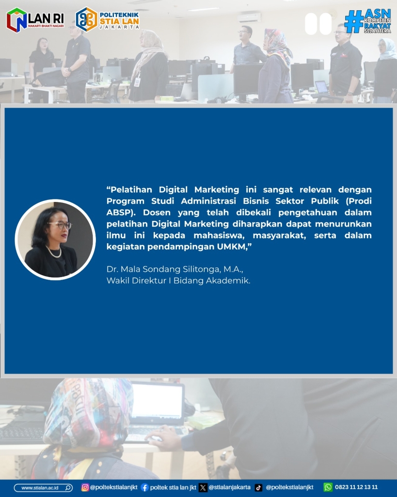 “Pelatihan Digital Marketing ini sangat relevan dengan Program Studi Administrasi Bisnis Sektor Publik (Prodi ABSP). Dosen yang telah dibekali pengetahuan dalam pelatihan Digital Marketing diharapkan dapat menurunkan ilmu ini kepada mahasiswa, masyarakat, serta dalam kegiatan pendampingan UMKM,” ujar Dr. Mala Sondang.