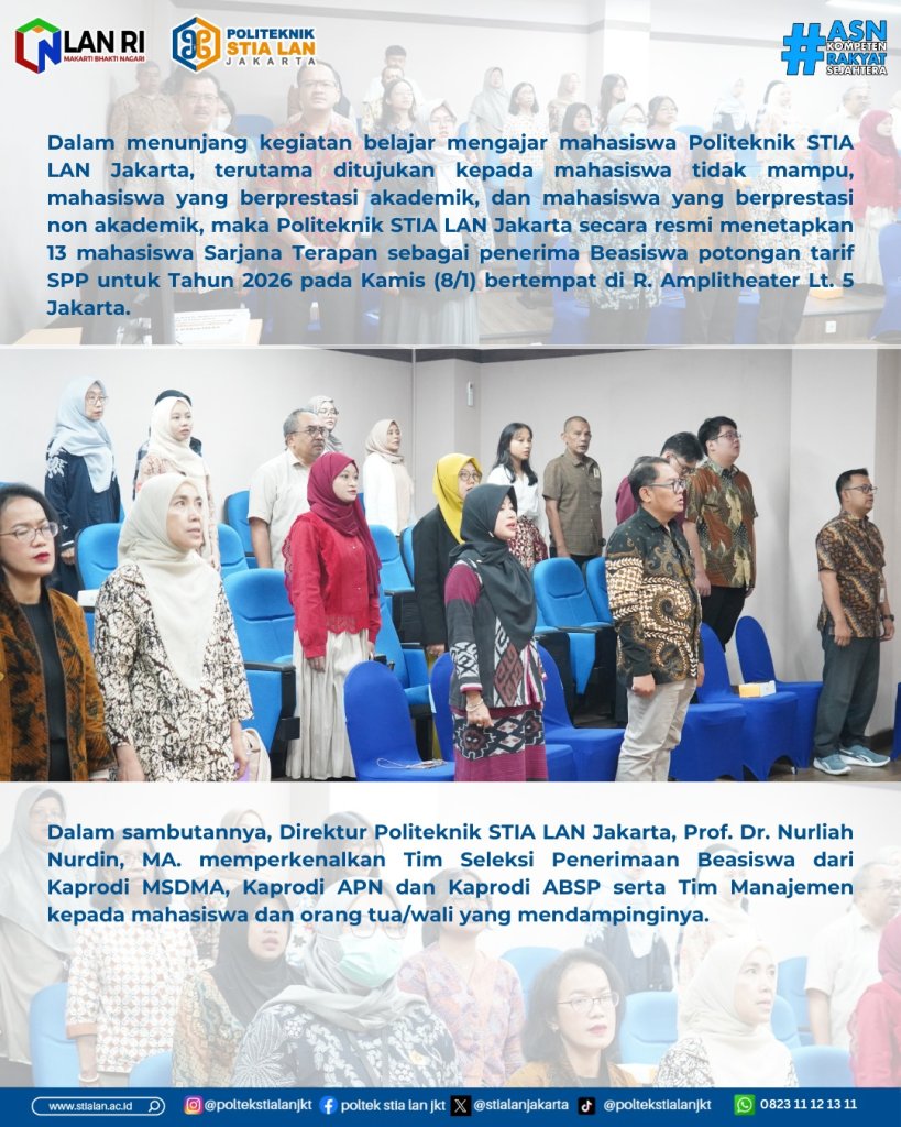 Jakarta, 8 Januari 2026 – Dalam menunjang kegiatan belajar mengajar mahasiswa Politeknik STIA LAN Jakarta, terutama ditujukan kepada mahasiswa tidak mampu, mahasiswa yang berprestasi akademik, dan mahasiswa yang berprestasi non akademik, maka Politeknik STIA LAN Jakarta secara resmi menetapkan 13 mahasiswa Sarjana Terapan sebagai penerima Beasiswa potongan tarif SPP untuk Tahun 2026 pada Kamis (8/1) bertempat di R. Amplitheater Lt. 5 Jakarta.