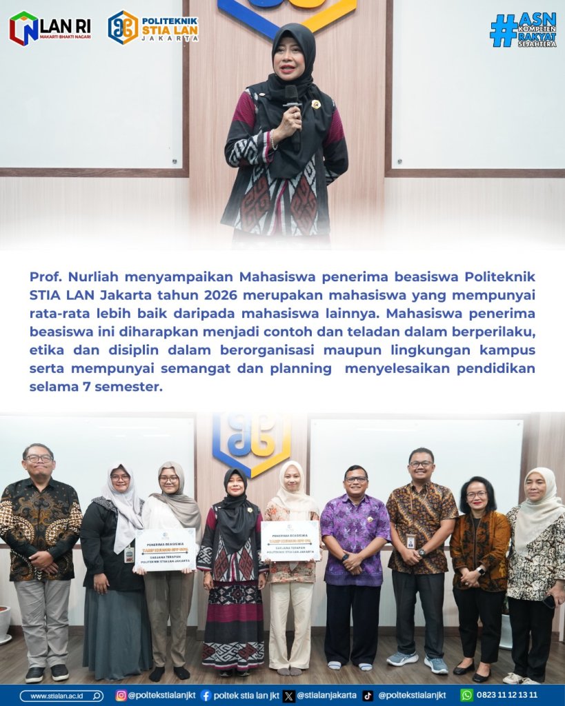 Prof. Nurliah menyampaikan Mahasiswa penerima beasiswa Politeknik STIA LAN Jakarta tahun 2026 merupakan mahasiswa yang mempunyai rata-rata lebih baik daripada mahasiswa lainnya. Mahasiswa penerima beasiswa ini diharapkan menjadi contoh dan teladan dalam berperilaku, etika dan disiplin dalam berorganisasi maupun lingkungan kampus serta mempunyai semangat dan planning menyelesaikan pendidikan selama 7 semester.