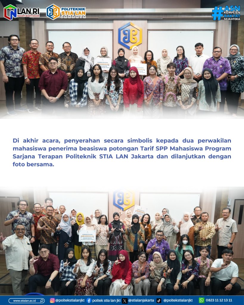 Di akhir acara, penyerahan secara simbolis kepada dua perwakilan mahasiswa penerima beasiswa potongan Tarif SPP Mahasiswa Program Sarjana Terapan Politeknik STIA LAN Jakarta dan dilanjutkan dengan foto bersama.