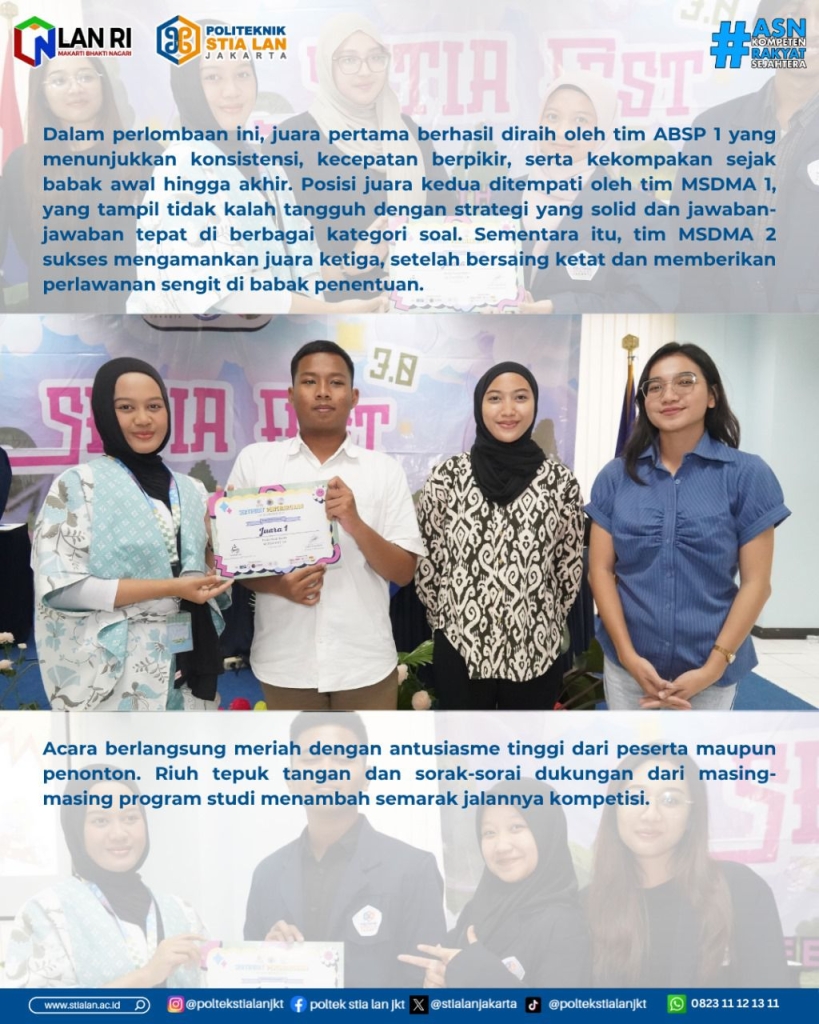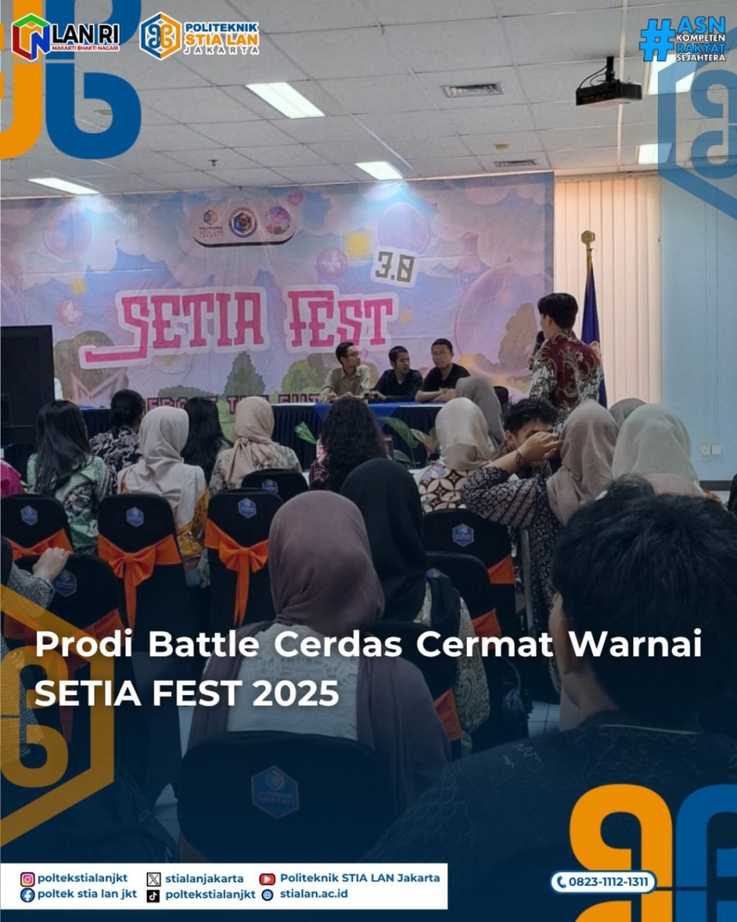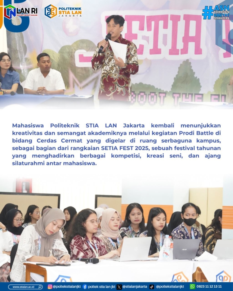 Jakarta, 1 Oktober 2025 – Mahasiswa Politeknik STIA LAN Jakarta kembali menunjukkan kreativitas dan semangat akademiknya melalui kegiatan Prodi Battle di bidang Cerdas Cermat, yang digelar di ruang serbaguna kampus Politeknik STIA LAN Jakarta.