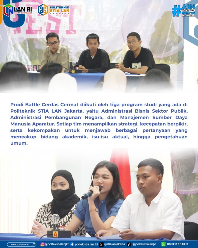 Prodi Battle Cerdas Cermat diikuti oleh tiga program studi yang ada di Politeknik STIA LAN Jakarta, yaitu Administrasi Bisnis Sektor Publik, Administrasi Pembangunan Negara, dan Manajemen Sumber Daya Manusia Aparatur. Setiap tim menampilkan strategi, kecepatan berpikir, serta kekompakan untuk menjawab berbagai pertanyaan yang mencakup bidang akademik, isu-isu aktual, hingga pengetahuan umum.