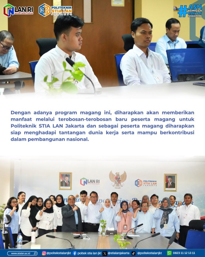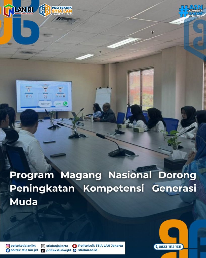 Jakarta, 16 Desember 2025 – Politeknik STIA LAN Jakarta menerima 10 peserta Program Magang Nasional yang menjadi salah satu upaya strategis pemerintah dalam meningkatkan kualitas sumber daya manusia, khususnya di kalangan lulusan baru. Melalui program ini peserta magang akan memperoleh kesempatan untuk merasakan langsung dunia kerja serta mengasah keterampilan yang relevan dengan kebutuhan satuan kerja. Magang Nasional ini bertujuan untuk menjembatani kesenjangan antara dunia pendidikan dan dunia kerja.10 peserta magang yang penempatannya di Politeknik STIA LAN Jakarta diterima secara resmi oleh Direktur Politeknik STIA LAN Jakarta, Prof. Dr. Nurliah Nurdin, MA. dan jajaran manajemen pada Selasa, (16/12) di Ruang Prof. Prajudi Lantai II. Magang Nasional ini akan berlangsung selama 6 (enam) bulan sejak tanggal 16 Desember 2025 sampai dengan 16 Juni 2026.