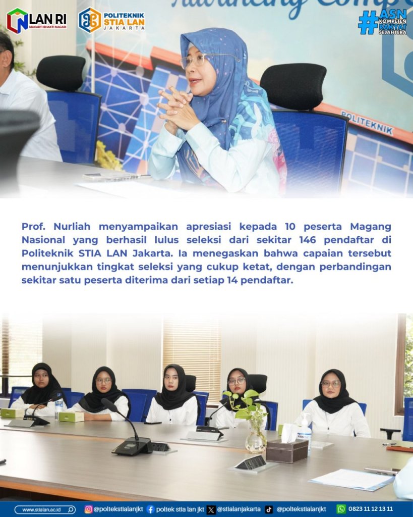 “Apresiasi terhadap 10 peserta magang yang telah lulus seleksi dari sekitar 146 peserta magang yang mendaftar di Politeknik STIA LAN Jakarta, artinya 1:14 yang diterima menjadi peserta magang nasional,” ujar Prof. Nurliah.